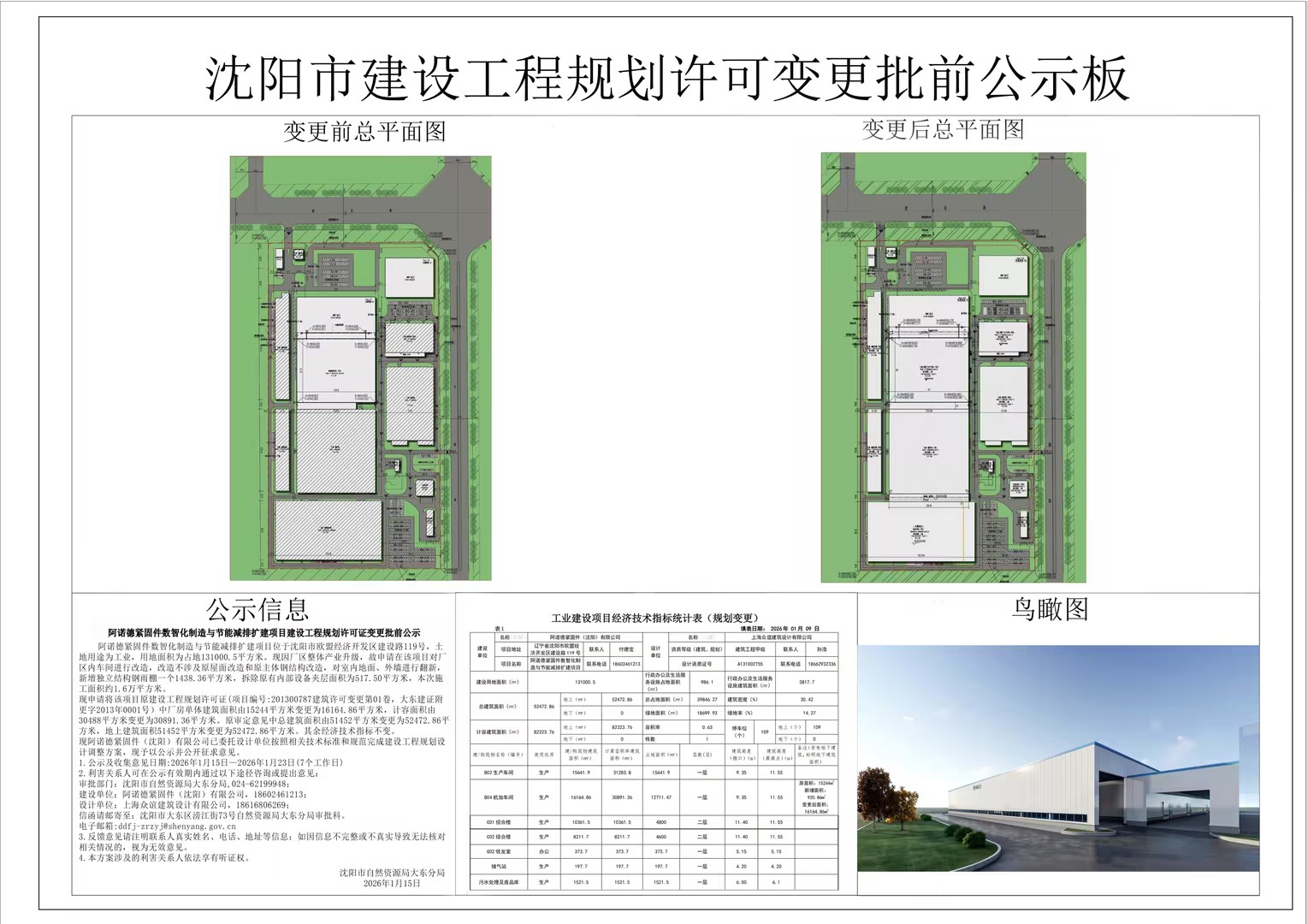 阿诺德紧固件数智化制造与节能减排扩建项目位于沈阳市欧盟经济开发区建设路119号,土地用途为工业,用地面积为占地131000.5平方米。现因厂区整体产业升级,故申请在该项目对厂区内车间进行改造,改造不涉及原屋面改造和原主体钢结构改造,对室内地面、外墙进行翻新,新增独立结构钢雨棚一个1438.36平方米,拆除原有内部设备夹层面积为517.50平方米,本次施工面积约1.6万平方米。 现申请将该项目原建设工程规划许可证(项目编号:201300787建筑许可变更第01卷,大东建证附更字2013年0001号)中厂房单体建筑面积由15244平方米变更为16164.86平方米,计容面积由30488平方米变更为30891.36平方米。原审定意见中总建筑面积由51452平方米变更为52472.86平方米,地上建筑面积由51452平方米变更为52472.86平方米。其余经济技术指标不变。 现阿诺德紧固件(沈阳)有限公司已委托设计单位按照相关技术标准和规范完成建设工程规划设计调整方案,现予以公示并公开征求意见。 1.公示及收集意见日期:2026年1月15日—2026年1月23日(7个工作日) 2.利害关系人可在公示有效期内通过以下途径咨询或提出意见: 审批部门:沈阳市自然资源局大东分局,024-62199948; 建设单位:阿诺德紧固件(沈阳)有限公司,18602461213; 设计单位:上海众谊建筑设计有限公司,18616806269; 信函请邮寄至:沈阳市大东区滂江街73号自然资源局大东分局审批科。 电子邮箱:ddfj-zrzyj@shenyang.gov.cn 3.反馈意见请注明联系人真实姓名、电话、地址等信息;如因信息不完整或不真实导致无法核对相关情况的,视为无效意见。 4.本方案涉及的利害关系人依法享有听证权。 沈阳市自然资源局大东分局 2026年1月15日