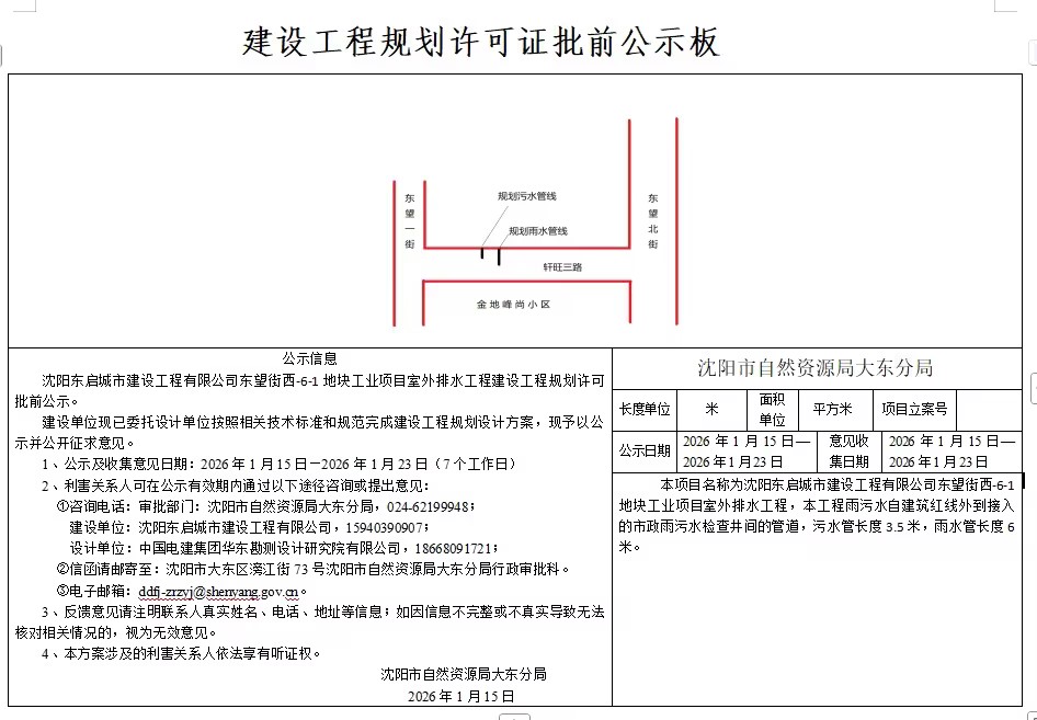 沈阳东启城市建设工程有限公司东望街西-6-1地块工业项目室外排水工程建设工程规划许可批前公示