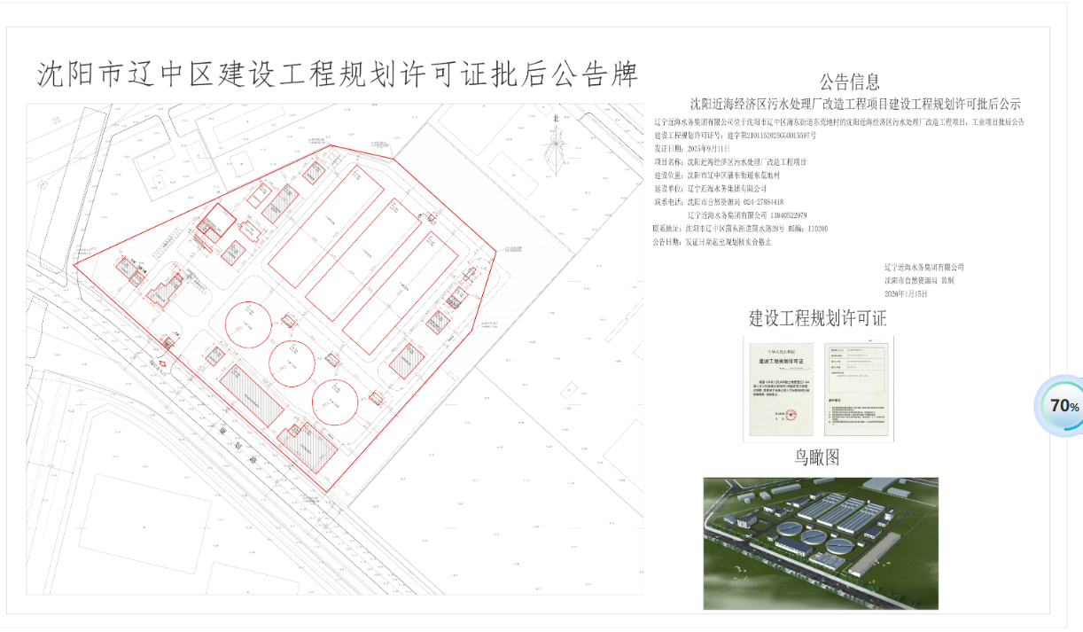 辽宁近海水务集团有限公司位于沈阳市辽中区蒲东街道东荒地村的沈阳近海经济区污水处理厂改造工程项目,工业项目批后公告 建设工程规划许可证号:建字第2101152025GG0015597号 发证日期:2025年9月11日 项目名称:沈阳近海经济区污水处理厂改造工程项目 建设位置:沈阳市辽中区蒲东街道东荒地村 建设单位:辽宁近海水务集团有限公司 联系电话:沈阳市自然资源局 024-27884418 辽宁近海水务集团有限公司 13840522979 联系地址:沈阳市辽中区蒲东街道蒲水路28号 邮编:110200 公告日期:发证日期起至规划核实合格止 辽宁近海水务集团有限公司 沈阳市自然资源局 监制 2026年1月15日