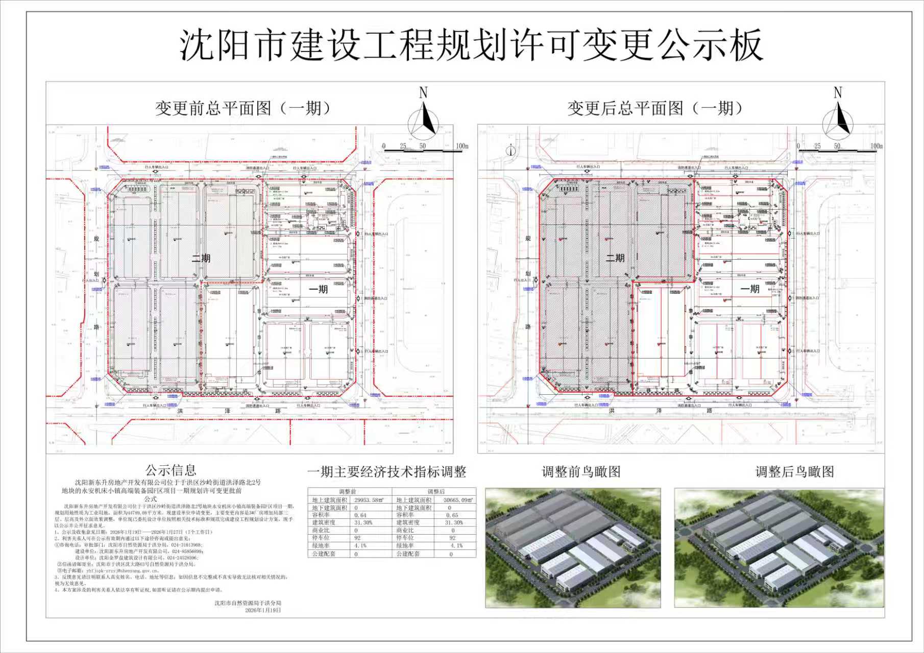 沈阳新东升房地产开发有限公司位于于洪区沙岭街道洪泽路北2号地块永安机床小镇高端装备园F区项目一期,规划用地性质为工业用地,面积为44789.08平方米。现建设单位申请变更,主要变更内容是3#厂房增加局部三层、层高及外立面效果调整,现已委托设计单位按照相关技术标准和规范完成建设工程规划设计方案,现予以公示并公开征求意见。 1、公示及收集意见日期:2026年1月19日——2026年1月27日(7个工作日) 2、利害关系人可在公示有效期内通过以下途径咨询或提出意见: ①咨询电话: 审批部门:沈阳市自然资源局于洪分局,024-31013968; 建设单位:沈阳新东升房地产开发有限公司,024-85856899; 设计单位:沈阳金罗盘建筑设计有限公司,024-24528596; ②信函请邮寄至;沈阳市于洪区沈大路63号自然资源局于洪分局。 ③电子邮箱:yhfjspk-zrzyj@shenyang.gov.cn 3、反馈意见请注明联系人真实姓名、电话、地址等信息;如因信息不完整或不真实导致无法核对相关情况的,视为无效意见。 4、本方案涉及的利害关系人依法享有听证权,如需听证请在公示期内提出申请。 沈阳市自然资源局于洪分局 2026年1月19日