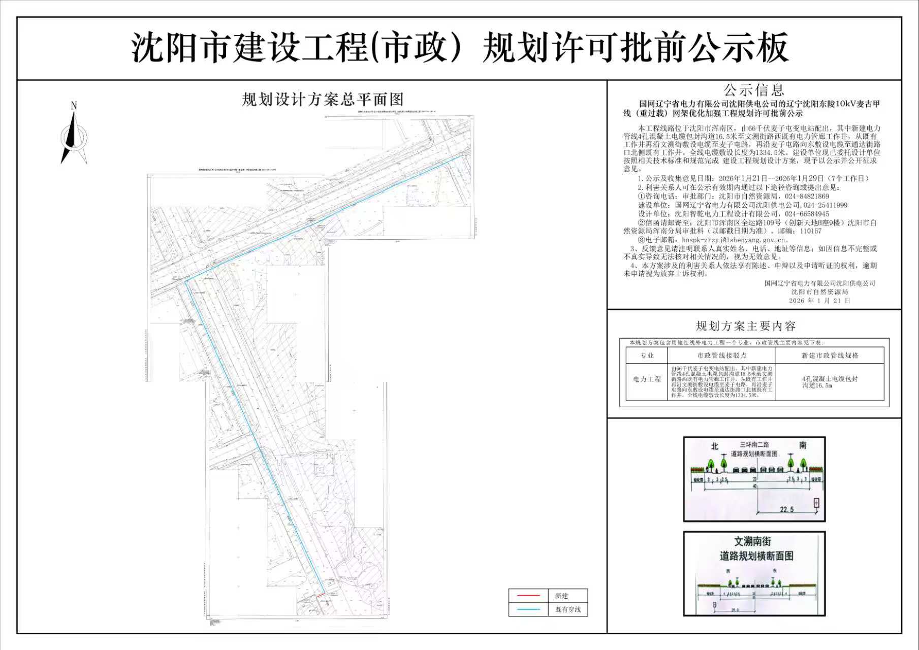 该电力工程位于沈阳市浑南区,本工程为麦古甲线(重过载)网架优化加强工程管线工程,位于沈阳市浑南区,由66千伏麦子屯变电站配出,其中新建电力管线4孔混凝土电缆包封沟道16.5米至文溯街路西既有电力管廊工作井,从既有工作井再沿文溯街敷设电缆至麦子屯路,再沿麦子屯路向东敷设电缆至通达街路口北侧既有工作井。全线电缆敷设长度为1334.5米。建设单位现已委托设计单位按照相关技术标准和规范完成建设工程规划设计方案,现予以公示并公开征求意见。 1、公示及收集意见日期:2026年1月21日——2026年1月29日(7个工作日) 2、利害关系人可在公示有效期内通过以下途径咨询或提出意见: ①咨询电话:审批部门:沈阳市自然资源局,024-84821869; 建设单位:国网辽宁省电力有限公司沈阳供电公司,024- 25411999; 设计单位:沈阳智乾电力工程设计有限公司,024-66584945。 ② 信函请邮寄至:沈阳市浑南区全运路109号(创新天地H座9楼)沈阳市自然资源局浑南分局审批科(以邮戳日期为准)邮编:110167 ③电子邮箱:hnspk-zrzyj@shenyang.gov.cn 3、反馈意见请注明联系人真实姓名、电话、地址等信息;如因信息不完整或不真实导致无法核对相关情况的,视为无效意见。 4、本方案涉及的利害关系人依法享有陈述、申辩以及申请听证等权利,逾期未申请则视为放弃上述权利。