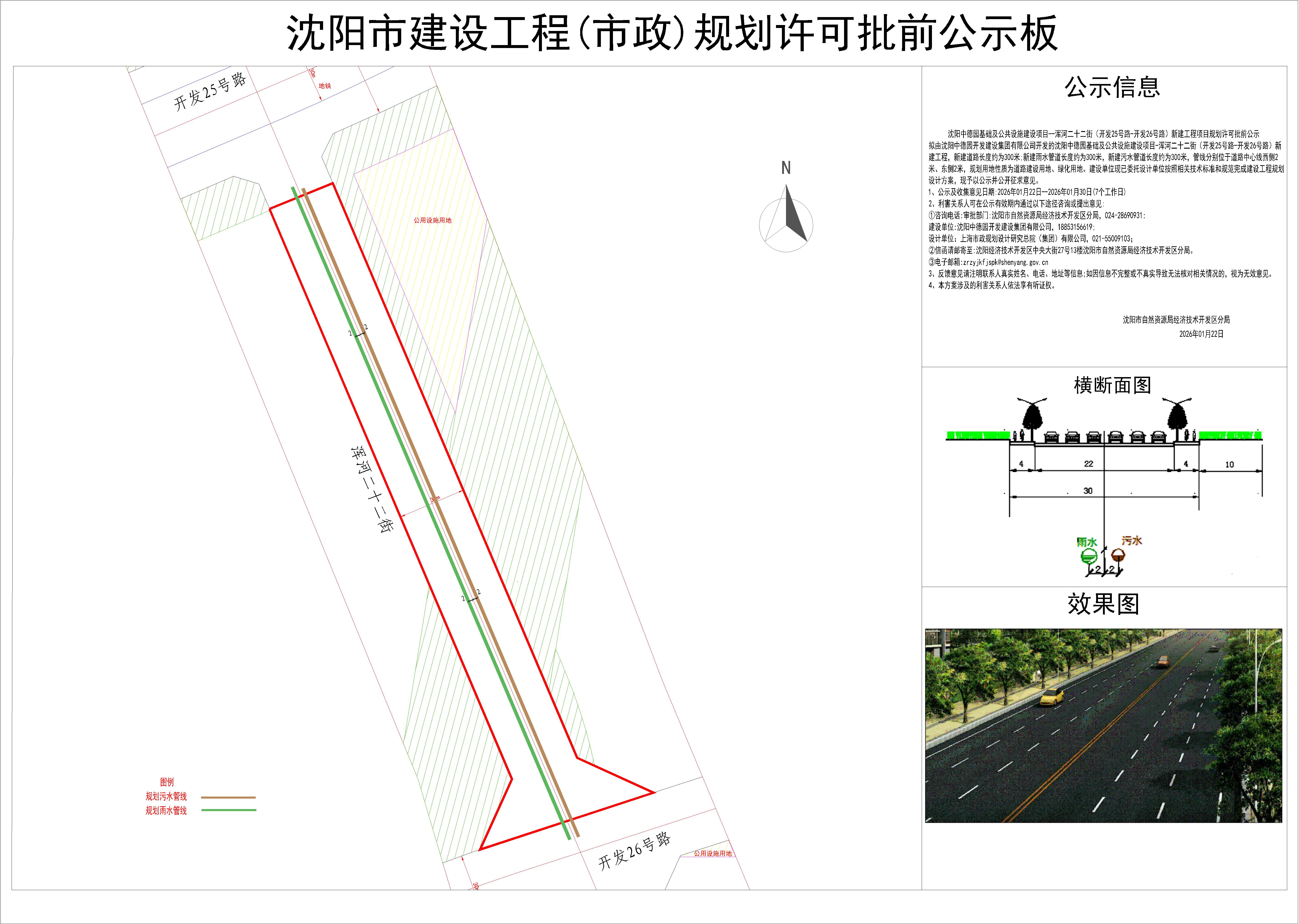 拟由沈阳中德园开发建设集团有限公司开发的沈阳中德园基础及公共设施建设项目-浑河二十二街(开发25号路-开发26号路)新建工程,新建道路长度约为300米;新建雨水管道长度约为300米,新建污水管道长度约为300米,管线分别位于道路中心线西侧2米、东侧2米,规划用地性质为道路建设用地、绿化用地。建设单位现已委托设计单位按照相关技术标准和规范完成建设工程规划设计方案,现予以公示并公开征求意见。 1、公示及收集意见日期:2026年1月22日--2026年1月30日(7个工作日) 2、利害关系人可在公示有效期内通过以下途径咨询或提出意见: ①咨询电话: 审批部门:沈阳市自然资源局经济技术开发区分局,024-28690931: 建设单位:沈阳中德园开发建设集团有限公司,18853156619; 设计单位:上海市政规划设计研究总院(集团)有限公司,021-55009103; ②信函请邮寄至:沈阳经济技术开发区中央大街27号13楼沈阳市自然资源局经济技术开发区分局。 ③电子邮箱:zrzyjkfjspk@shenyang.gov.cn 3、反馈意见请注明联系人真实姓名、电话、地址等信息;如因信息不完整或不真实导致无法核对相关情况的,视为无效意见。 4、本方案涉及的利害关系人依法享有听证权。 沈阳市自然资源局经济技术开发区分局 2026年1月22日