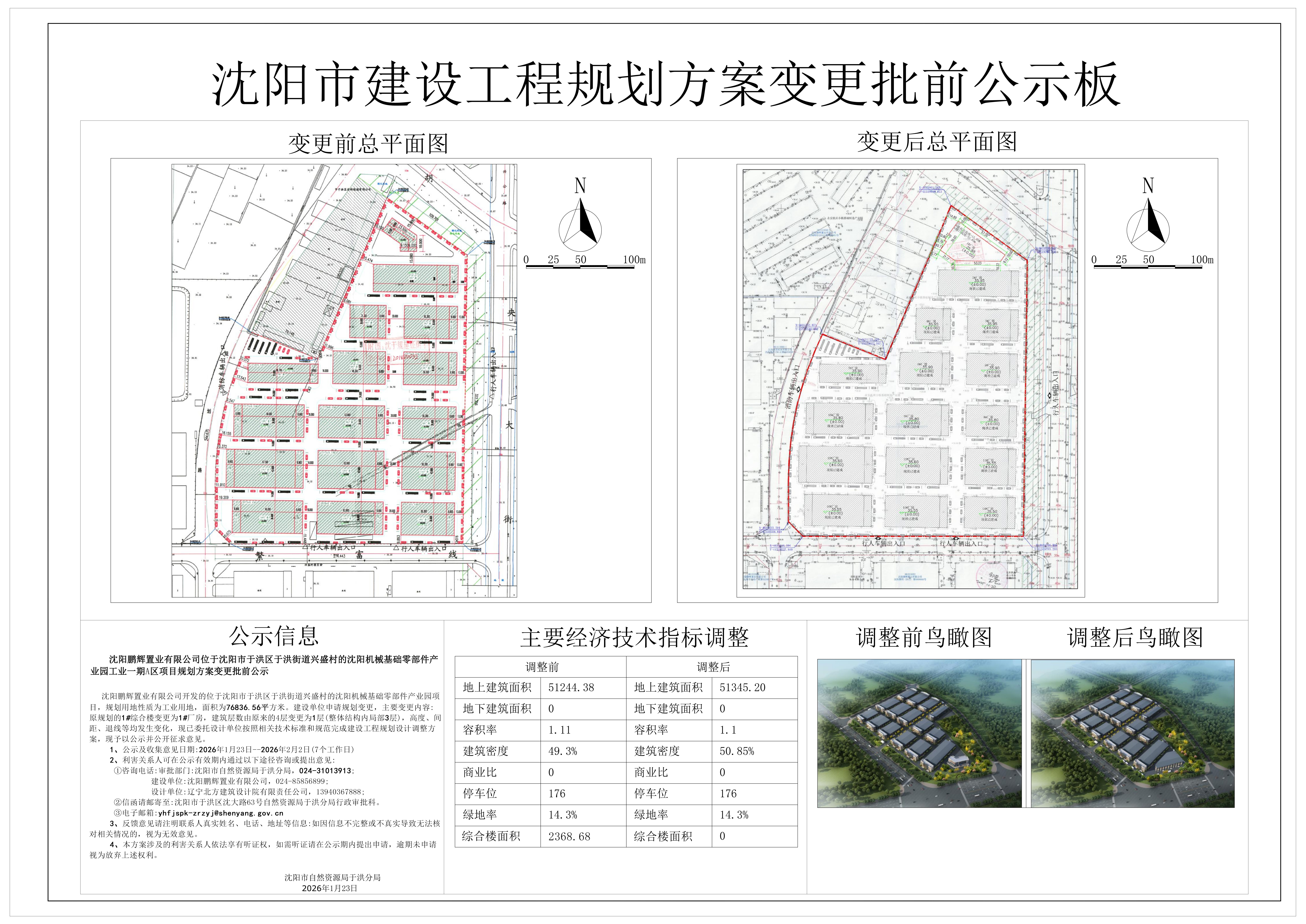 沈阳鹏辉置业有限公司开发的位于沈阳市于洪区于洪街道兴盛村的沈阳机械基础零部件产业园项目,规划用地性质为工业用地,面积为76836.56平方米。建设单位申请规划变更,主要变更内容:原规划的1#综合楼变更为1#厂房,建筑层数由原来的4层变更为1层(整体结构内局部3层),高度、间距、退线等均发生变化,现已委托设计单位按照相关技术标准和规范完成建设工程规划设计调整方案,现予以公示并公开征求意见。 1、公示及收集意见日期:2026年1月23日--2026年2月2日(7个工作日) 2、利害关系人可在公示有效期内通过以下途径咨询或提出意见: ①咨询电话: 审批部门:沈阳市自然资源局于洪分局,024-31013913; 建设单位:沈阳鹏辉置业有限公司,024-85856899; 设计单位:辽宁北方建筑设计院有限责任公司,13940367888; ②信函请邮寄至:沈阳市于洪区沈大路63号自然资源局于洪分局行政审批科。 ③电子邮箱:yhfjspk-zrzyj@shenyang.gov.cn 3、反馈意见请注明联系人真实姓名、电话、地址等信息:如因信息不完整或不真实导致无法核对相关情况的,视为无效意见。 4、本方案涉及的利害关系人依法享有听证权,如需听证请在公示期内提出申请,逾期未申请视为放弃上述权利。 沈阳市自然资源局于洪分局 2026年1月23日