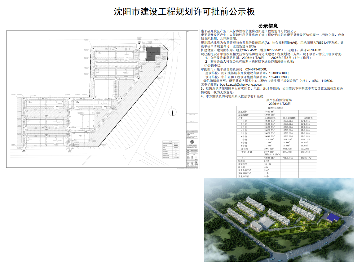 康平县开发区产业工人保障性租赁住房改扩建工程位于沈阳市康平县开发区纺织园一二号路之间,应急储备库北侧,北环路西侧。 规划用地性质为公共管理与公共服务设施用地(A)、社会福利用地(A6),用地面积为78521.4平方米。建设单位申请规划许可,主要新建内容为: (1)扩建食堂,建筑面积为:地上2879.45㎡(增加1815.25㎡),无地下,共计2879.45㎡; 现已委托设计单位按照相关技术标准和规范完成建设工程规划设计方案,现予以公示并公开征求意见。 1、公示及收集意见日期:2026年1月26日—— 2026年2月3日(7个工作日) 2、利害关系人可在公示有效期内通过以下途径咨询或提出意见: ①咨询电话: 审批部门:康平县自然资源局,024-87342668; 建设单位:沈阳康懿城市开发建设有限公司,13109871800; 设计单位:中仁正和工程设计集团有限公司,15940033998; ②信函请邮寄至:康平县政务服务中心三楼收(请注明“规划公示”字样),邮编:110500。 ③电子邮箱:bgs-kpzrzyj@shenyang.gov.cn 3、反馈意见请注明联系人真实姓名、电话、地址等信息;如因信息不完整或不真实导致无法核对相关情况的,视为无效意见。 4、本方案涉及的利害关系人依法享有听证权。 康平县自然资源局 2026年1月26日