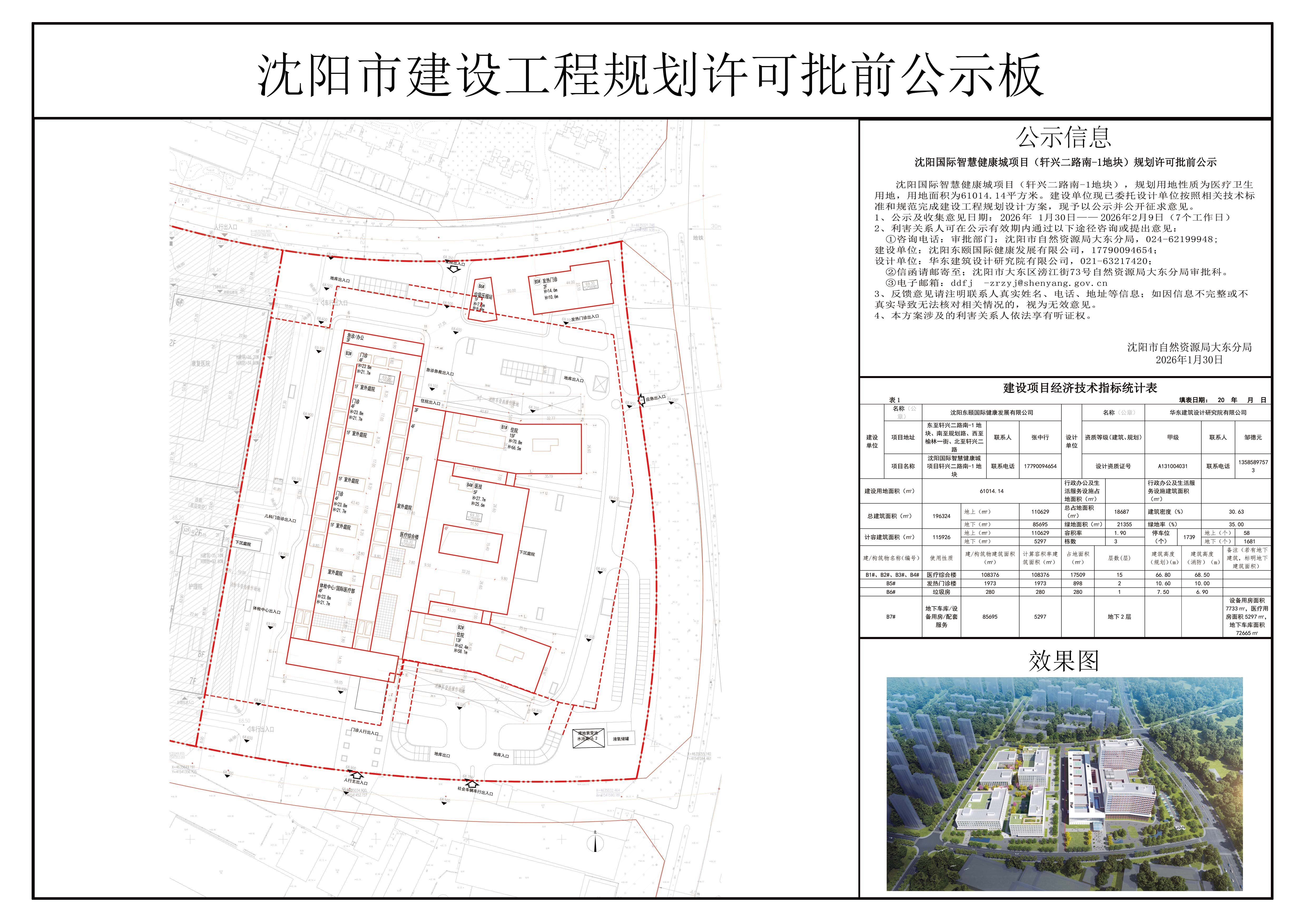 沈阳国际智慧健康城项目(轩兴二路南-1地块),规划用地性质为医疗卫生用地,用地面积为61014.14平方米。建设单位现已委托设计单位按照相关技术标准和规范完成建设工程规划设计方案,现予以公示并公开征求意见。 1、公示及收集意见日期:2026年1月30日——2026年2月9日(7个工作日) 2、利害关系人可在公示有效期内通过以下途径咨询或提出意见: ①咨询电话: 审批部门:沈阳市自然资源局大东分局,024-62199948; 建设单位:沈阳东颐国际健康发展有限公司,17790094654; 设计单位:华东建筑设计研究院有限公司,021-63217420; ②信函请邮寄至;沈阳市大东区滂江街73号自然资源局大东分局审批科。 ③电子邮箱:ddfj-zrzyj@shenyang.gov.cn 3、反馈意见请注明联系人真实姓名、电话、地址等信息;如因信息不完整或不真实导致无法核对相关情况的,视为无效意见。 4、本方案涉及的利害关系人依法享有听证权。 沈阳市自然资源局大东分局 2026年1月30日