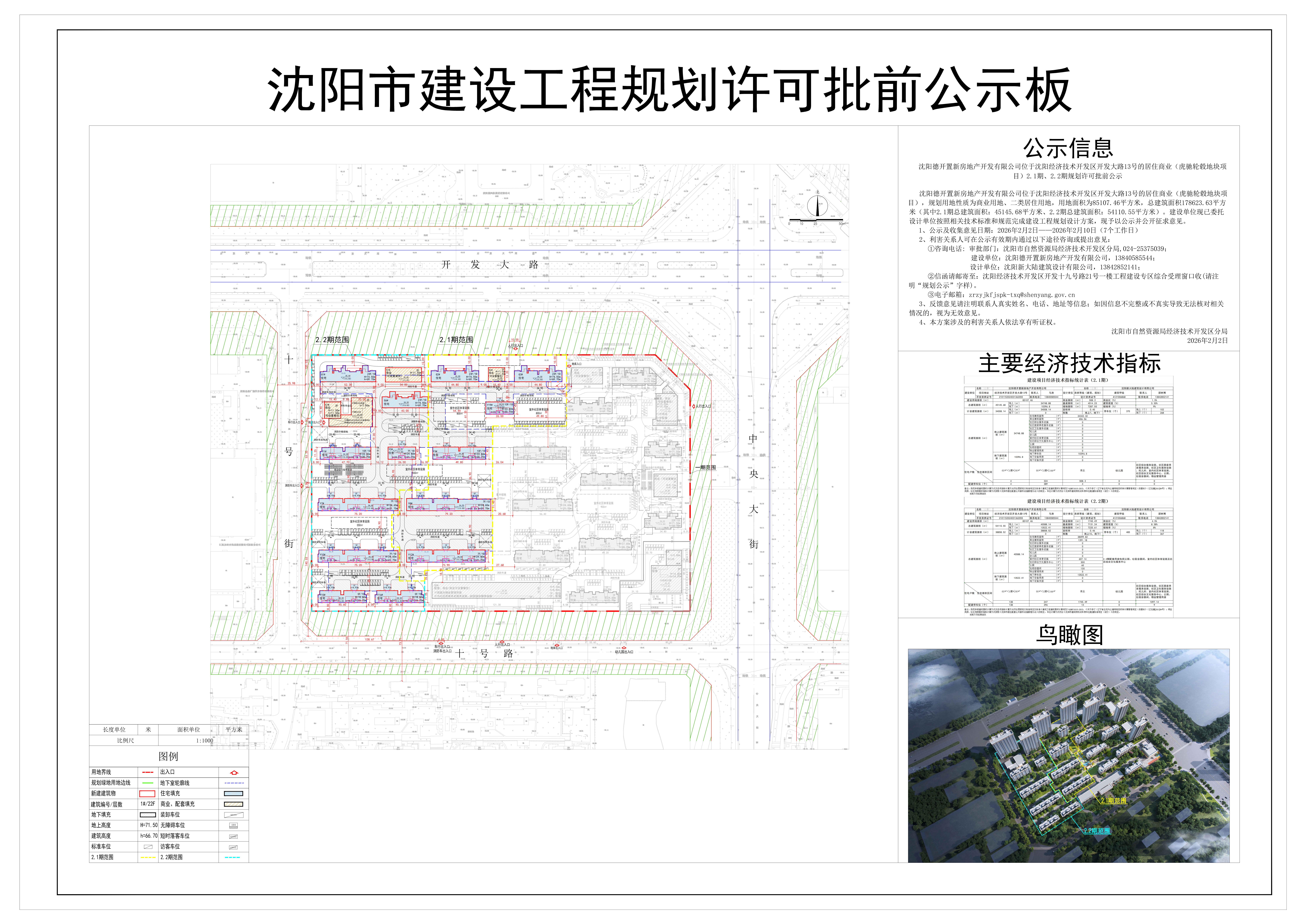 沈阳德开置新房地产开发有限公司位于沈阳经济技术开发区开发大路13号的居住商业(虎驰轮毂地块项目),规划用地性质为商业用地、二类居住用地,用地面积为85107.46平方米,总建筑面积178623.63平方米(其中2.1期总建筑面积:45145.68平方米、2.2期总建筑面积:54110.55平方米)。建设单位现已委托设计单位按照相关技术标准和规范完成建设工程规划设计方案,现予以公示并公开征求意见。 1、公示及收集意见日期:2026年2月2日——2026年2月10日(7个工作日) 2、利害关系人可在公示有效期内通过以下途径咨询或提出意见: ①咨询电话: 审批部门:沈阳市自然资源局经济技术开发区分局,024-25375039; 建设单位:沈阳德开置新房地产开发有限公司,13840585544; 设计单位:沈阳新大陆建筑设计有限公司,13842852141; ②信函请邮寄至:沈阳经济技术开发区开发十九号路21号一楼工程建设专区综合受理窗口收(请注明“规划公示”字样) ③电子邮箱:zrzyjkfjspk-txq@shenyang.gov.cn 3、反馈意见请注明联系人真实姓名、电话、地址等信息;如因信息不完整或不真实导致无法核对相关情况的,视为无效意见。 4、本方案涉及的利害关系人依法享有听证权。 沈阳市自然资源局经济技术开发区分局 2026年2月2日