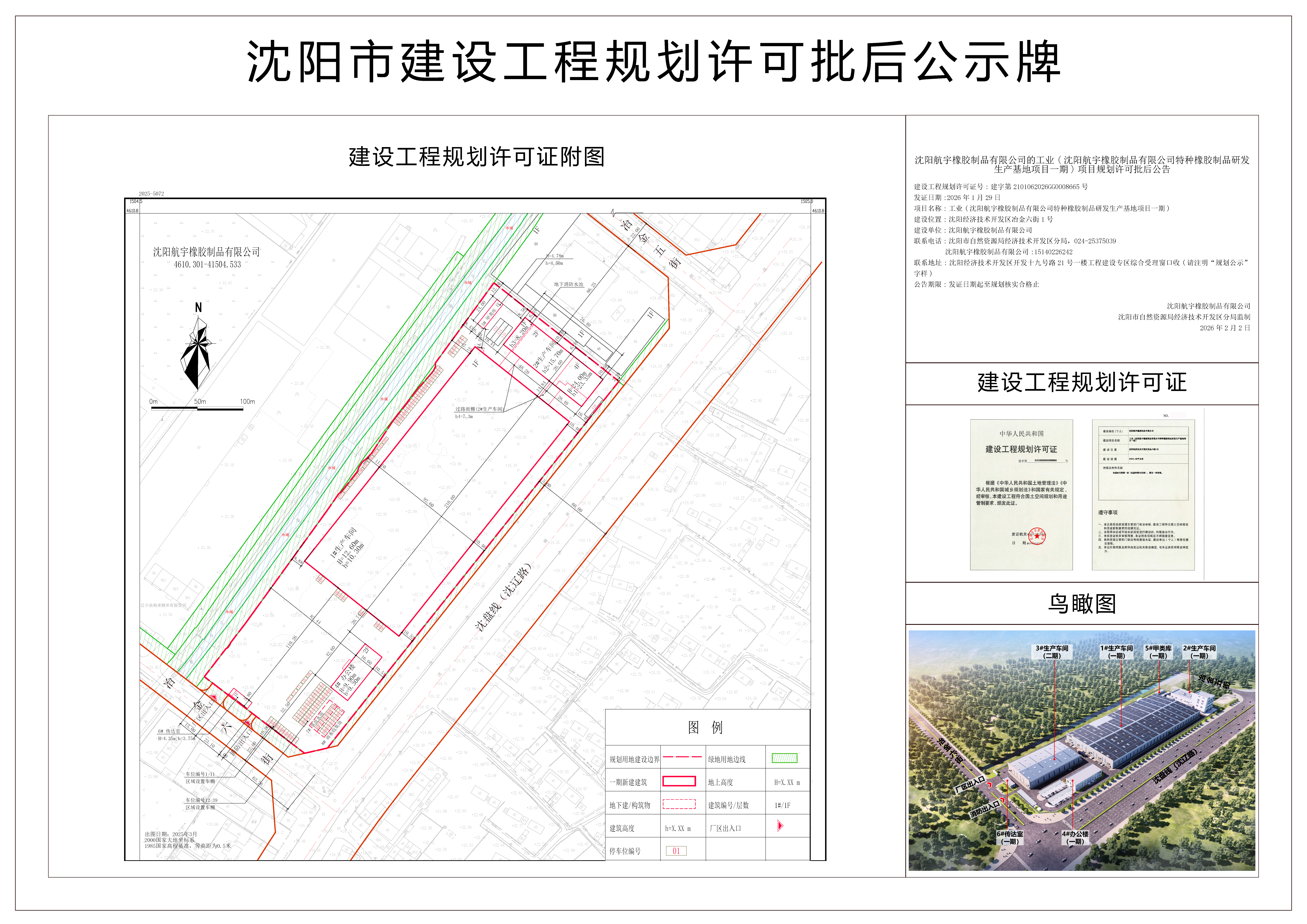 沈建设工程规划许可证号:建字第2101062026GG0008665号 发证日期:2026年1月29日 项目名称:工业(沈阳航宇橡胶制品有限公司特种橡胶制品研发生产基地项目一期) 建设位置:沈阳经济技术开发区冶金六街1号 建设单位:沈阳航宇橡胶制品有限公司 联系电话:沈阳市自然资源局经济技术开发区分局,024-25375039 沈阳航宇橡胶制品有限公司,15140226242 联系地址:沈阳经济技术开发区开发十九号路21号一楼工程建设专区综合受理窗口收(请注明“规划公示”字样) 公告期限:发证日期起至规划核实合格止 沈阳航宇橡胶制品有限公司 沈阳市自然资源局经济技术开发区分局 监制 2026年2月2日