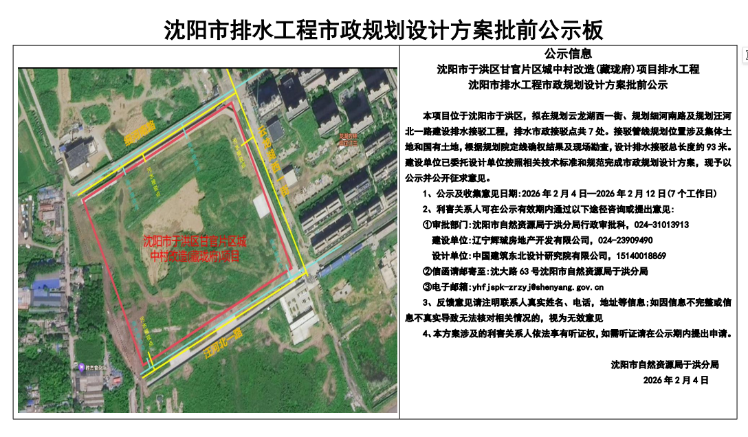 沈阳市于洪区甘官片区城中村改造(藏珑府)项目排水工程沈阳市排水工程市政规划设计方案批前公示