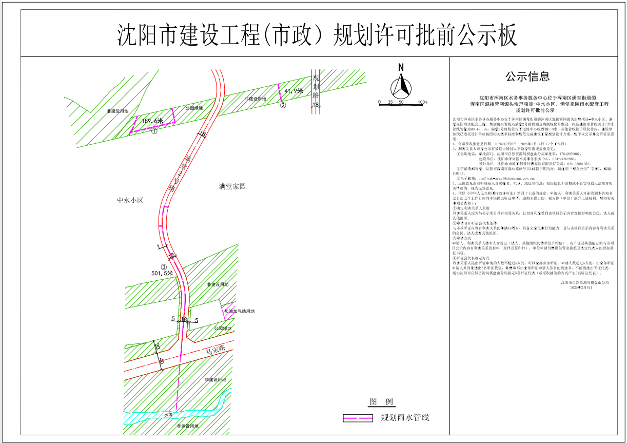 沈阳市浑南区水务事务服务中心位于浑南区满堂街道的浑南区混接管网源头治理项目-中水小区、满堂家园雨水配套工程,规划雨水管线沿满堂2号路西侧及两侧绿化带敷设,拟新建雨水管线共计733米,管线管径为D0.4-1.2m,满堂2号路线位位于道路中心线西侧1.0米,其他管线位于绿化带内。建设单位现已委托设计单位按照相关技术标准和规范完成建设工程规划设计方案,现予以公示并公开征求意见。 1、公示及收集意见日期:2026年2月6日--2026年2月14日(7个工作日) 2、利害关系人可在公示有效期内通过以下途径咨询或提出意见: ①咨询电话: 审批部门:沈阳市自然资源局棋盘山分局审批科,17642059007; 建设单位:沈阳市浑南区水务事务服务中心,024-24262083; 设计单位:沈阳市市政工程设计研究院有限责任公司,024-23881952。 ②信函请邮寄至:沈阳市浑南区森林路88号(以邮戳日期为准,请注明“规划公示”字样),邮编:110163。 ③电子邮箱:qpsfjspk-zrzyj@shenyang.gov.cn 3、反馈意见请注明联系人真实姓名、电话、地址等信息;如因信息不完整或不真实导致无法核对相关情况的,视为无效意见。 4、依照《中华人民共和国行政许可法》第四十七条的规定,申请人、利害关系人可在收到本告知书之日起五个工作日内向本局提出听证申请,逾期未提出的,视为你(单位)放弃上述权利。现将有关事项公告如下: ①确定利害关系人原则 利害关系人应为与公示项目具有相邻关系,且切身利益受到该项目公示内容直接影响的公民、法人或其他组织。 ②申请召开听证会代表条件 与本项听证内容有利害关系的年满18周岁、具备完全民事行为能力,且与该项目公示内容有利害关系的公民、法人或者其他组织。 ③申请方式 申请人、利害关系人持本人身份证(法人、其他组织的持单位介绍信)、房产证及其他能证明与该项目公示内容有利害关系的材料(原件及复印件);单位申请另需提供营业执照及法定代表人的授权委托书等。 ④听证会代表确定方式 利害关系人提出听证申请的人数不超过5人的,可以全部参加听证;申请人数超过5人的,由全部听证申请人共同推选出5名听证代表,并需填写由全部听证申请人签名的推选书,不能推选出听证代表,则由沈阳市自然资源局棋盘山分局指定5名听证代表(或采取抽签的方式产生5名听证代表)。 沈阳市自然资源局棋盘山分局 2026年2月6日