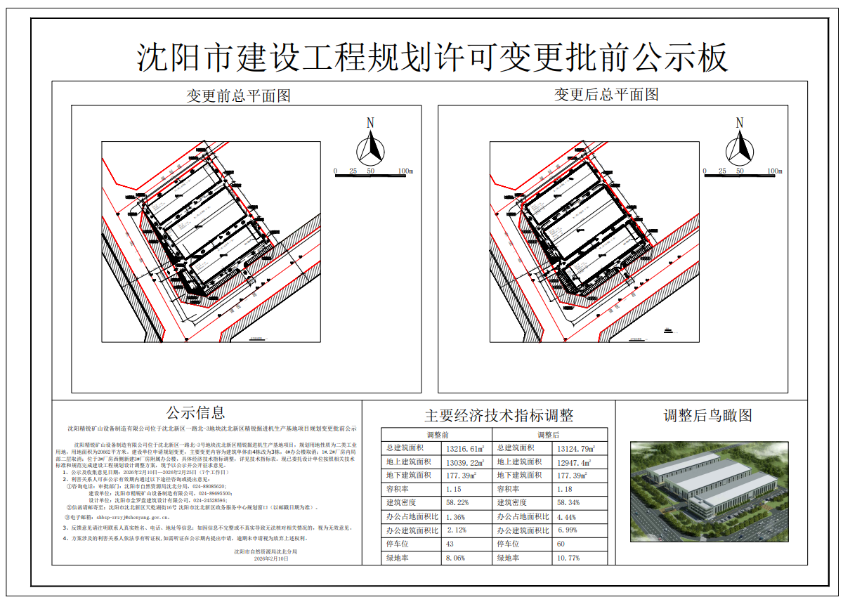 沈阳精锐矿山设备制造有限公司位于沈北新区一路北-3号地块沈北新区精锐掘进机生产基地项目,规划用地性质为二类工业用地,用地面积为20662平方米。建设单位申请规划变更,主要变更内容为建筑单体由4栋改为3栋,4#办公楼取消;1#.2#厂房内局部二层取消;位于3#厂房西侧新建3#厂房附属办公楼,具体经济技术指标调整,详见技术指标表。现已委托设计单位按照相关技术标准和规范完成建设工程规划设计调整方案,现予以公示并公开征求意见。 1、公示及收集意见日期:2026年2月10日--2026年2月25日(7个工作日) 2、利害关系人可在公示有效期内通过以下途径咨询或提出意见: ①咨询电话: 审批部门:沈阳市自然资源局沈北分局,024-88085620; 建设单位:沈阳精锐矿山设备制造有限公司,024-89695500; 设计单位:沈阳市金罗盘建筑设计有限公司,024-24528596; ②信函请邮寄至;沈阳市沈北新区天乾湖街16号 沈阳市沈北新区政务服务中心规划窗口(以邮戳日期为准) ③电子邮箱:shbsp-zrzyj@shenyang.gov.cn 3、反馈意见请注明联系人真实姓名、电话、地址等信息;如因信息不完整或不真实导致无法核对相关情况的,视为无效意见。 4、方案涉及的利害关系人依法享有听证权,如需听证在公示期内提出申请,逾期未申请视为放弃上述权利。