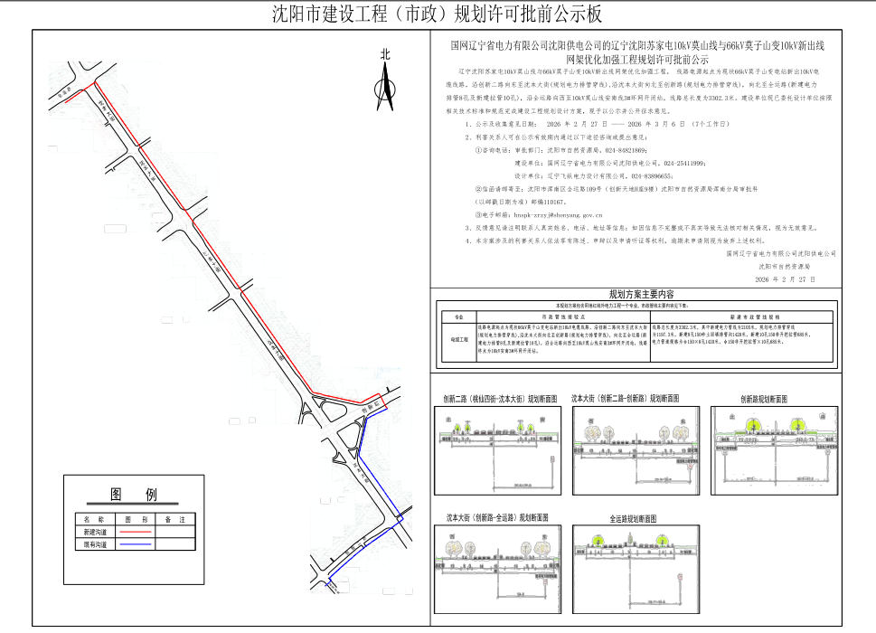 辽宁沈阳苏家屯10kV莫山线与66kV莫子山变10kV新出线网架优化加强工程, 线路电源起点为现状66kV莫子山变电站新出10kV电缆线路,沿创新二路向东至沈本大街(规划电力排管穿线),沿沈本大街向北至创新路(规划电力排管穿线),向北至全运路(新建电力排管8孔及新建拉管10孔),沿全运路向西至10kV莫山线安南线3#环网开闭站,线路总长度为3302.3米。建设单位现已委托设计单位按照相关技术标准和规范完成建设工程规划设计方案,现予以公示并公开征求意见。 1、公示及收集意见日期:2026年2月27日——2026年3月6日(7个工作日) 2、利害关系人可在公示有效期内通过以下途径咨询或提出意见: ①咨询电话: 审批部门:沈阳市自然资源局,024-84821869; 建设单位:国网辽宁省电力有限公司沈阳供电公司,024-25411999; 设计单位:辽宁飞纵电力设计有限公司,024-83896655; ②信函请邮寄至:沈阳市浑南区全运路109号(创新天地H座9楼)沈阳市自然资源局浑南分局审批科(以邮戳日期为准)邮编110167。 ③电子邮箱:hnspk-zrzyj@shenyang.gov.cn 3、反馈意见请注明联系人真实姓名、电话、地址等信息;如因信息不完整或不真实导致无法核对相关情况,视为无效意见。 4、本方案涉及的利害关系人依法享有陈述、申辩以及申请听证等权利,逾期未申请则视为放弃上述权利。 国网辽宁省电力有限公司沈阳供电公司 沈阳市自然资源局 2026年2月27日