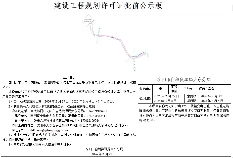 建设单位现已委托设计单位按照相关技术标准和规范完成建设工程规划设计方案,现予以公示并公开征求意见。 1、公示及收集意见日期:2026年2月27日—2026年3月6日(7个工作日) 2、利害关系人可在公示有效期内通过以下途径咨询或提出意见: ①咨询电话: 审批部门:沈阳市自然资源局大东分局,024-62199948; 建设单位:国网辽宁省电力有限公司沈阳供电公司,024-23154851; 设计单位:中铁第六勘察设计院集团有限公司,17703219996; ②信函请邮寄至:沈阳市大东区滂江街73号沈阳市自然资源局大东分局行政审批科。 ③电子邮箱:ddfj-zrzyj@shenyang.gov.cn 3、反馈意见请注明联系人真实姓名、电话、地址等信息;如因信息不完整或不真实导致无法核对相关情况的,视为无效意见。 4、本方案涉及的利害关系人依法享有听证权。 沈阳市自然资源局大东分局 2026年2月27日