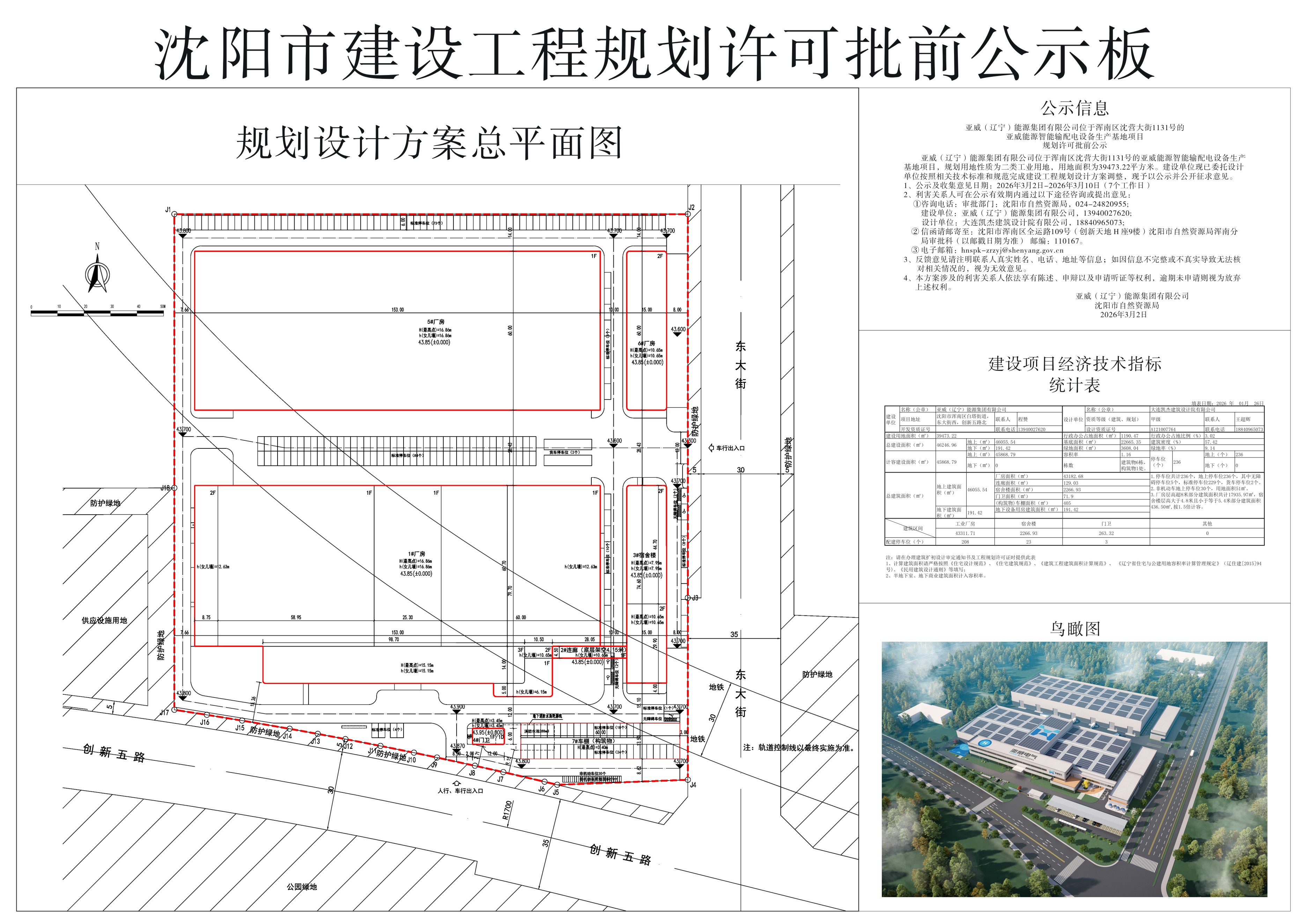 亚威(辽宁)能源集团有限公司位于浑南区沈营大街1131号的亚威能源智能输配电设备生产基地项目,规划用地性质为二类工业用地,用地面积为39473.22平方米。建设单位现已委托设计单位按照相关技术标准和规范完成建设工程规划设计方案调整,现予以公示并公开征求意见 1、公示及收集意见日期:2026年3月2日﹣-2026年3月10日(7个工作日) 2、利害关系人可在公示有效期内通过以下途径咨询或提出意见: ①咨询电话: 审批部门:沈阳市自然资源局,024-24820955; 建设单位:亚威(辽宁)能源集团有限公司,13940027620; 设计单位:大连凯杰建筑设计院有限公司,18840965073: ②信函请邮寄至:沈阳市浑南区全运路109号(创新天地H座9楼)沈阳市自然资源局浑南分局审批科(以邮戳日期为准)邮编:110167。 ③电子邮箱:hnspk-zrzyj@shenyang.gov.cn 3、反馈意见请注明联系人真实姓名、电话、地址等信息;如因信息不完整或不真实导致无法核对相关情况的,视为无效意见。 4、本方案涉及的利害关系人依法享有陈述、申辩以及申请听证等权利,逾期未申请则视为放弃上述权利。 亚威(辽宁)能源集团有限公司 沈阳市自然资源局 2026年3月2日