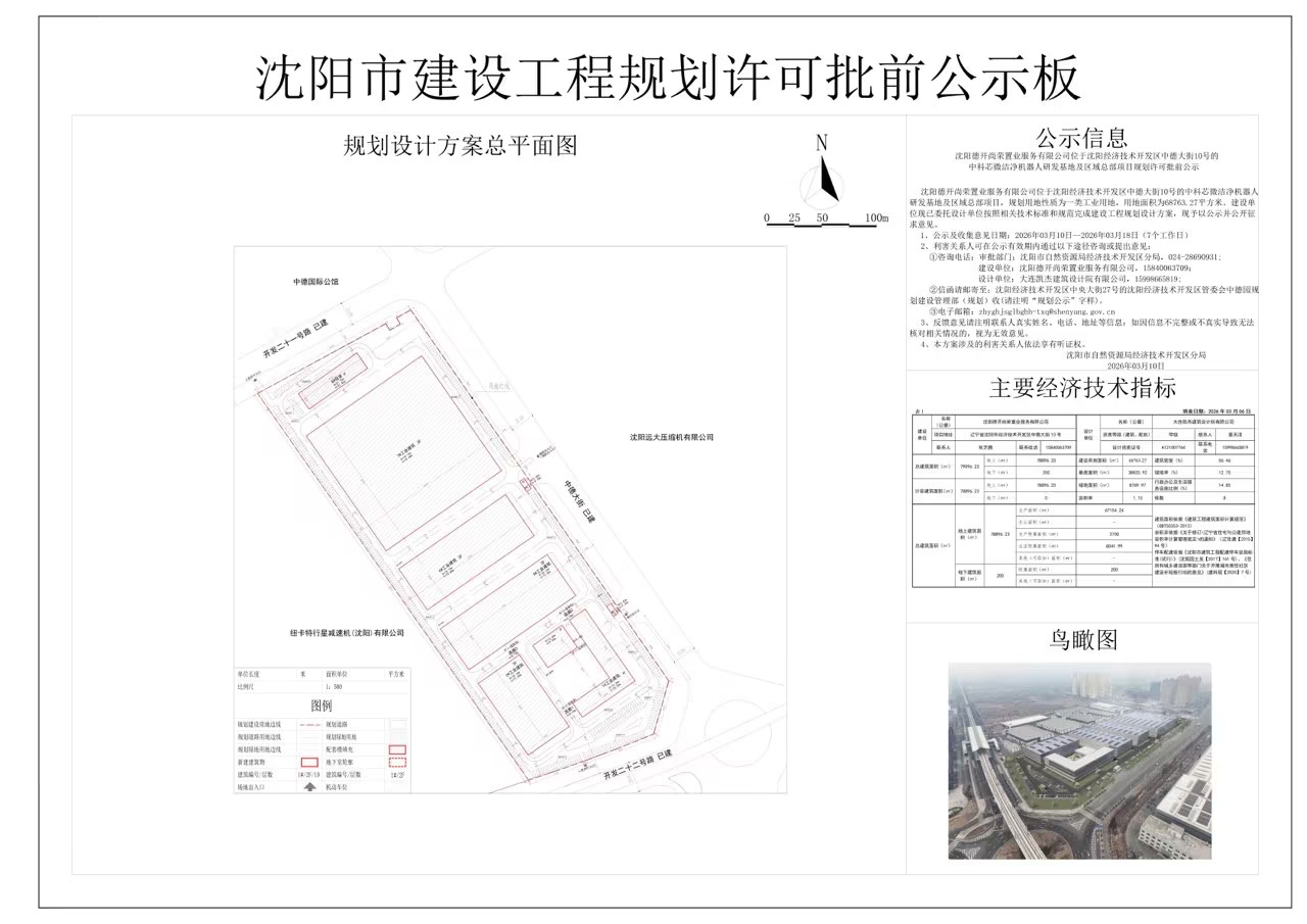 沈阳德开尚荣置业服务有限公司位于沈阳经济技术开发区中德大街10号的中科芯微洁净机器人研发基地及区域总部项目,规划用地性质为一类工业用地,用地面积为68763.27平方米。建设单位现已委托设计单位按照相关技术标准和规范完成建设工程规划设计方案,现予以公示并公开征求意见。 1、公示及收集意见日期:2026年03月10日——2026年3月18日(7个工作日) 2、利害关系人可在公示有效期内通过以下途径咨询或提出意见: ①咨询电话: 审批部门:沈阳市自然资源局经济技术开发区分局,024-28690931; 建设单位:沈阳德开尚荣置业服务有限公司,15840063709; 设计单位:大连凯杰建筑设计院有限公司,15998665819; ②信函请邮寄至:沈阳经济技术开发区中央大街27号沈阳经济技术开发区管委会中德园规划建设管理部 (规划)收(请注明“规划公示”字样)。 ③电子邮箱:zdyghjsglbghb-txq@shenyang.gov.cn 3、反馈意见请注明联系人真实姓名、电话、地址等信息;如因信息不完整或不真实导致无法核对相关情况的,视为无效意见。 4、本方案涉及的利害关系人依法享有听证权。 沈阳市自然资源局经济技术开发区分局 2026年3月10日