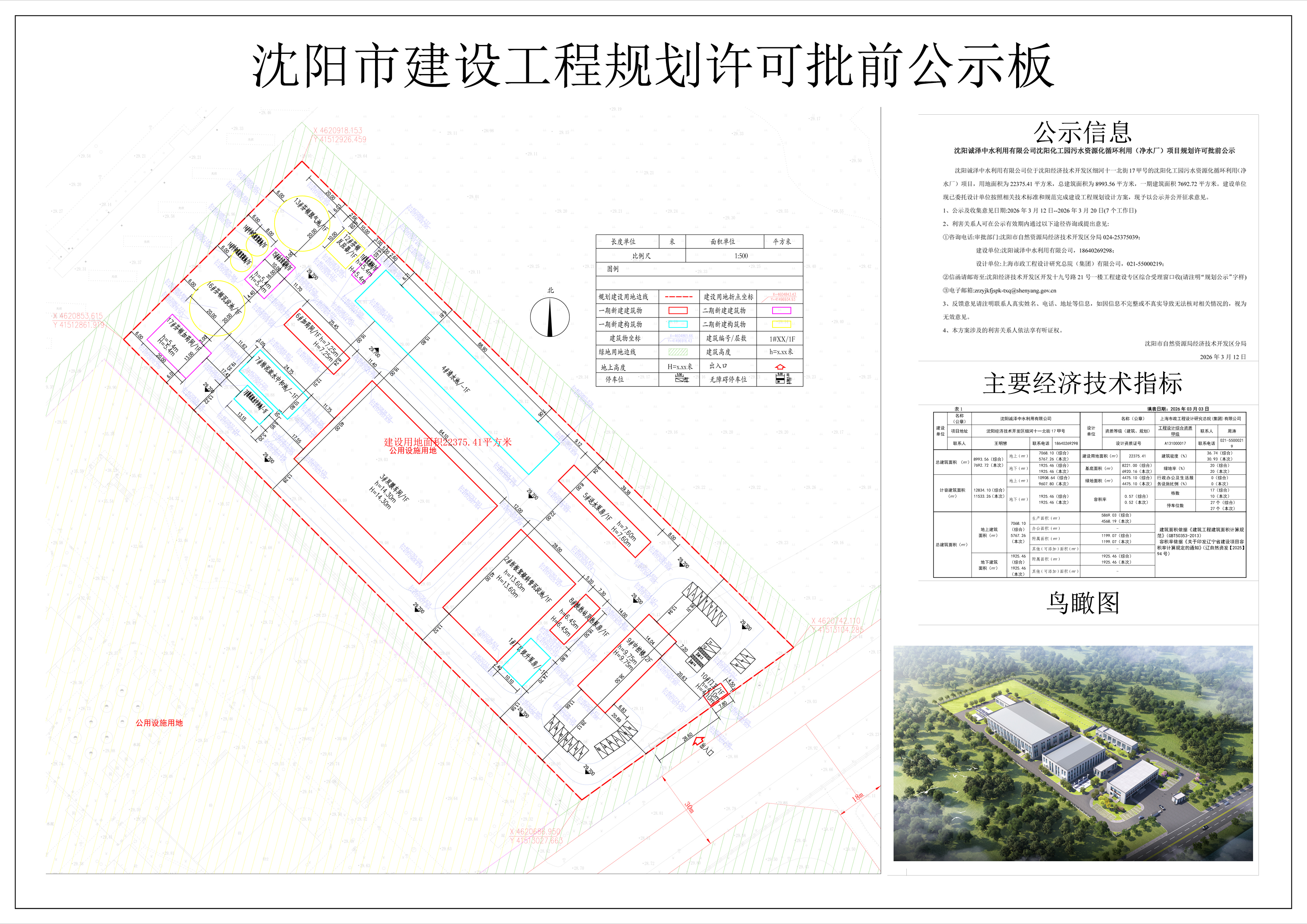 沈阳诚泽中水利用有限公司位于沈阳经济技术开发区细河十一北街17甲号的沈阳化工园污水资源化循环利用(净水厂)项目,用地面积为22375.41平方米,总建筑面积为8993.56平方米,一期建筑面积7692.72平方米。建设单位现已委托设计单位按照相关技术标准和规范完成建设工程规划设计方案,现予以公示并公开征求意见。 1、公示及收集意见日期:2026年3月12日--2026年3月20日(7个工作日) 2、利害关系人可在公示有效期内通过以下途径咨询或提出意见: ①咨询电话: 审批部门:沈阳市自然资源局经济技术开发区分局024-25375039; 建设单位:沈阳诚泽中水利用有限公司,18640269298; 设计单位:上海市政工程设计研究总院(集团)有限公司,021-55000219; ②信函请邮寄至:沈阳经济技术开发区开发十九号路21号一楼工程建设专区综合受理窗口收(请注明“规划公示”字样) ③电子邮箱:zrzyjkfjspk-txq@shenyang.gov.cn 3、反馈意见请注明联系人真实姓名、电话、地址等信息,如因信息不完整或不真实导致无法核对相关情况的,视为无效意见。 4、本方案涉及的利害关系人依法享有听证权。 沈阳市自然资源局经济技术开发区分局 2026年3月12日