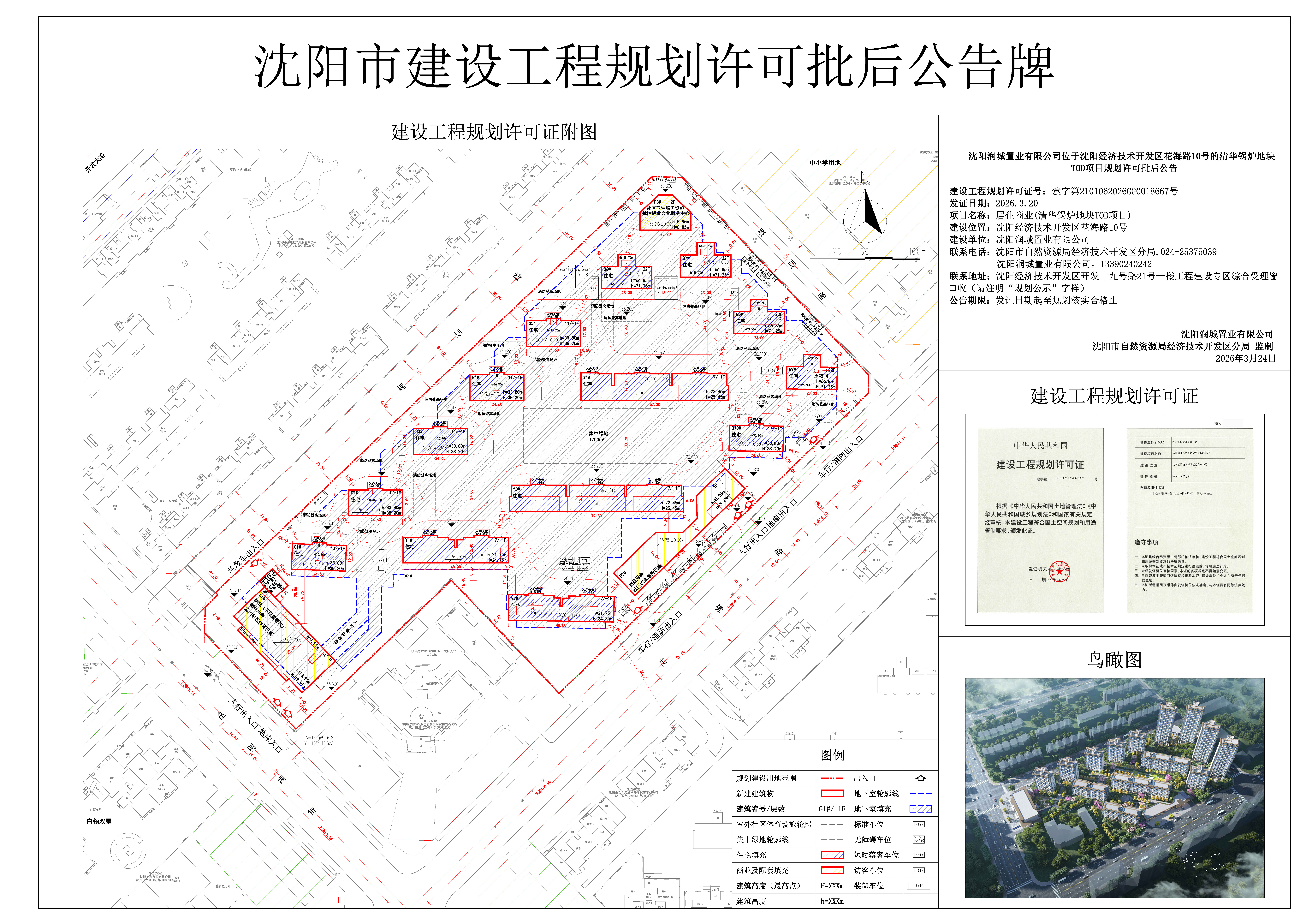 建设工程规划许可证号:建字第2101062026GG0018667号 发证日期:2026.3.20 项目名称:居住商业(清华锅炉地块TOD项目) 建设位置:沈阳经济技术开发区花海路10号 建设单位:沈阳润城置业有限公司 联系电话:沈阳市自然资源局经济技术开发区分局,024-25375039 沈阳润城置业有限公司,13390240242 联系地址:沈阳经济技术开发区开发十九号路21号一楼工程建设专区综合受理窗口收(请注明“规划公示”字样) 公告期限:发证日期起至规划核实合格止 沈阳润城置业有限公司 沈阳市自然资源局经济技术开发区分局 监制 2026年3月24日