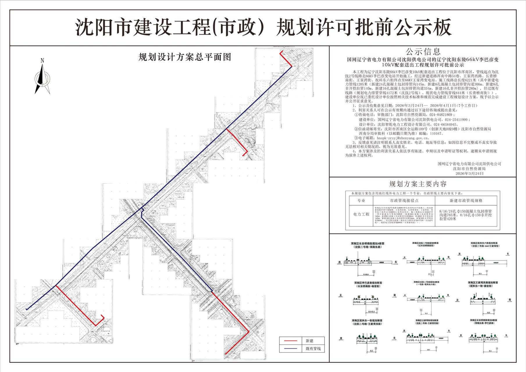 本工程为辽宁沈阳东陵66kV李巴彦变10kV配套送出工程位于沈阳市浑南区,管线起点为沈抚2号线路北66KV李巴彦变电站开始施工,经过新建道路浑南中路54巷、王家湾西路、长青桥南街、王家湾街、祝科东六街终点至66KV王家湾变电站。施工线路总长度6221米(其中新建电力管线1205米(新建24孔混凝土包封排管沟145m、新建8孔混凝土包封排管沟道306m、新建8孔非开挖拉管140m、新建16孔混凝土包封排管沟道334m、新建16孔非开挖拉管280m),经过既有线路(规划电力排管穿线4172米(沈抚2号线)、现状电力管线穿线844米(长青桥南街))。建设单位现已委托设计单位按照相关技术标准和规范完成建设工程规划设计方案,现予以公示并公开征求意见。 1、公示及收集意见日期: 2026年3月24日—2026年4月1日(7个工作日) 2、利害关系人可在公示有效期内通过以下途径咨询或提出意见: ①咨询电话: 审批部门:沈阳市自然资源局,024-84821869; 建设单位:国网辽宁省电力有限公司沈阳供电公司,024-25411999; 设计单位:沈阳智乾电力工程设计有限公司,024-66584945。 ② 信函请邮寄至:沈阳市浑南区全运路109号(创新天地H座9楼)沈阳市自然资源局浑南分局审批科(以邮戳日期为准)邮编:110167。 ③电子邮箱:hnspk-zrzyj@shenyang.gov.cn 3、反馈意见请注明联系人真实姓名、电话、地址等信息;如因信息不完整或不真实导致无法核对相关情况的,视为无效意见。 4、本方案涉及的利害关系人依法享有陈述、申辩以及申请听证等权利,逾期未申请则视为放弃上述权利。 国网辽宁省电力有限公司沈阳供电公司 沈阳市自然资源局 2026年3月24日