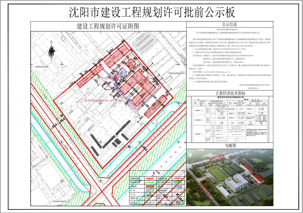 沈阳天峰生物制药有限公司年产2220吨高端磷脂精深加工及创新辅料创新药物研发中心项目,规划用地性质为工业用地,用地面积为50346.48平方米,建筑面积16316.75平方米。建设单位现已委托设计单位按照相关技术标准和规范完成建设工程规划设计方案,现予以公示并公开征求意见。 1、公示及收集意见日期:2026年4月1日--2026年4月10日(7个工作日) 2、利害关系人可在公示有效期内通过以下途径咨询或提出意见: ①咨询电话: 审批部门:沈阳市自然资源局经济技术开发区分局024-25375039; 建设单位:沈阳天峰生物制药有限公司,16609802776; 设计单位:吉林医药设计院有限公司,13889314930。 ②信函请邮寄至:沈阳经济技术开发区开发十九号路21号一楼工程建设专区综合受理窗口收(请注明“规划公示”字样)。 ③电子邮箱:zrzyjkfjspk-txq@shenyang.gov.cn 3、反馈意见请注明联系人真实姓名、电话、地址等信息;如因信息不完整或不真实导致无法核对相关情况的,视为无效意见。 4、本方案涉及的利害关系人依法享有听证权。 沈阳市自然资源局经济技术开发区分局 2026年4月1日