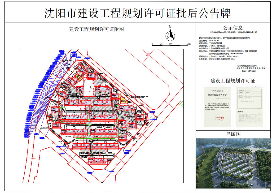 建设工程规划许可证编号:建字第2101142026GG0010656号 发证日期:2026.3.31 项目名称:丁香湖9号项目 建设位置:于洪区,北陵街道 建设单位:沈阳靖湖置业有限公司 联系电话:沈阳市自然资源局于洪分局行政审批科,024-25311043 沈阳靖湖置业有限公司,024-31056666 联系地址:沈阳市于洪区沈大路63号,邮编:110000 公告期限:发证日期起至规划核实合格止 沈阳靖湖置业有限公司 沈阳市自然资源局于洪分局 监制 2026年4月2日