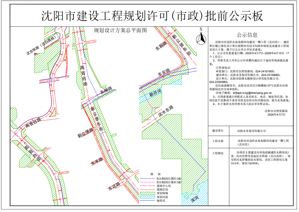 沈阳市应急供水南北联络线建设一期工程(沈河段),建设单位现已委托设计单位按照相关技术标准和规范完成建设工程规划设计方案,现予以公示并公开征求意见。 1、公示及收集意见日期:2026年4月7日----2025年4月15日(7个工作日) 2、利害关系人可在公示有效期内通过以下途径咨询或提出意见: ①咨询电话: 审批部门:沈阳市自然资源局,024-24161605; 建设单位:沈阳水务集团有限公司,024-25160083; 设计单位:沈阳市给排水勘察设计研究院有限公司,024-23393665; ②信函请邮寄至:沈阳市沈河区万柳塘路107号,沈阳市自然资源局沈河分局审批科。 ③电子邮箱: shfjspk-zrzyj@shenyang.gov.cn 3、反馈意见请注明联系人真实姓名、电话、地址等信息;如因信息不完整或不真实导致无法核对相关情况的,视为无效意见。 4、本方案涉及的利害关系人依法享有听证权。