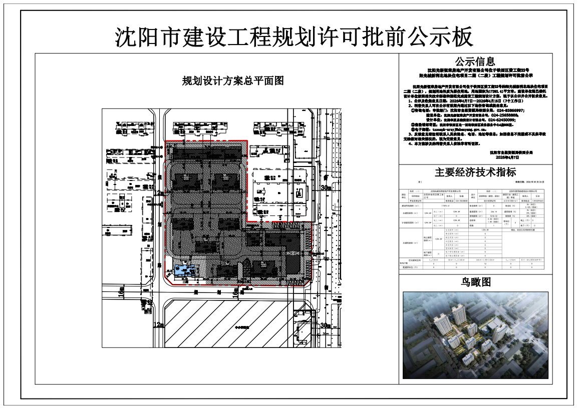 沈阳光新恒荣房地产开发有限公司位于铁西区赞工街22号的阳光城新利北地块住宅项目二期(二段),规划用地性质为居住用地,用地面积为17393.41平方米。建设单位现已委托设计单位按照相关技术标准和规范完成建设工程规划设计方案,现予以公示并公开征求意见。 1、公示及收集意见日期:2026年4月7日--2026年4月15日(7个工作日) 2、利害关系人可在公示有效期内通过以下途径咨询或提出意见: ①咨询电话: 审批部门:沈阳市自然资源局铁西分局,024-85866997; 建设单位:沈阳光新恒荣房产开发有限公司,024-25658888; 设计单位:沈阳华夏易建筑设计有限公司,024-62450099; ②信函请邮寄至:沈阳市铁西区北一西路铁西区政务服务中心A座605室。 ③电子邮箱:txxzspk-zrzyj@shenyang.gov.cn 3、反馈意见请注明联系人真实姓名、电话、地址等信息,如因信息不完整或不真实导致无法核对相关情况的,视为无效意见。 4、本方案涉及的利害关系人依法享有听证权。 沈阳市自然资源局铁西分局 2026年4月7日