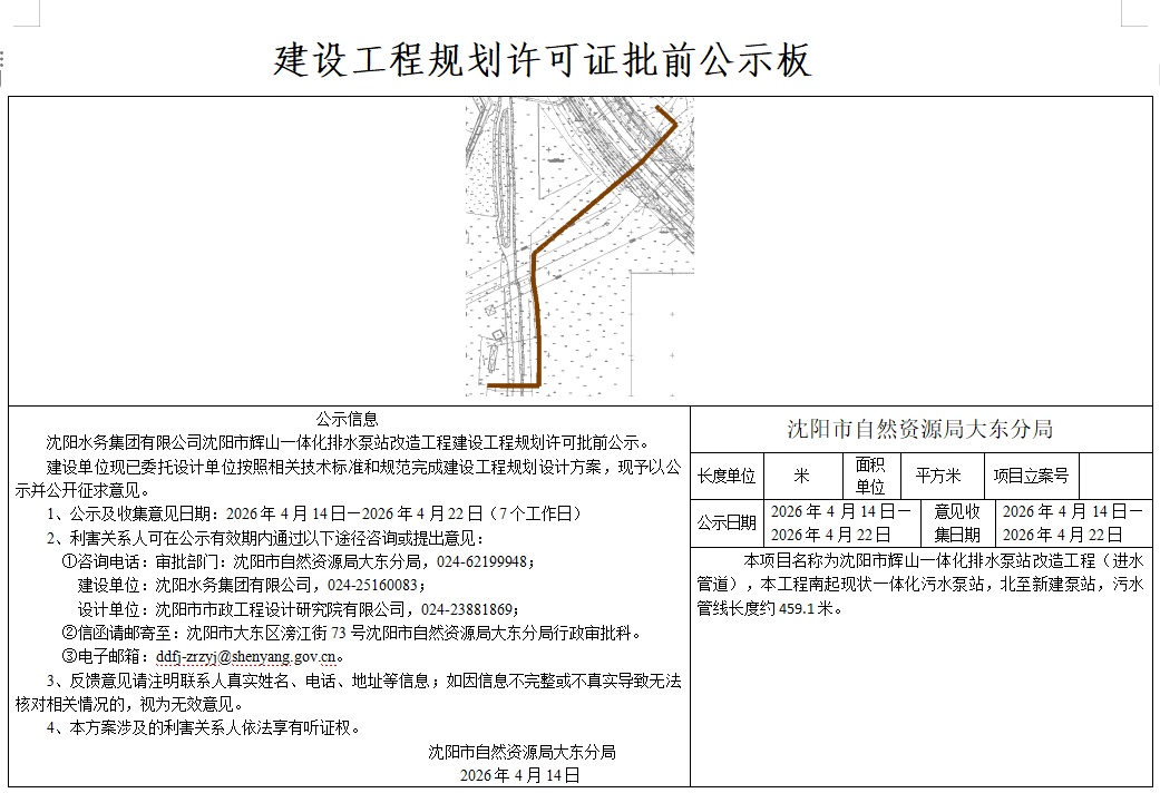 建设单位现已委托设计单位按照相关技术标准和规范完成建设工程规划设计方案,现予以公示并公开征求意见。 1、公示及收集意见日期:2026年4月14日—2026年4月22日(7个工作日) 2、利害关系人可在公示有效期内通过以下途径咨询或提出意见: ①咨询电话: 审批部门:沈阳市自然资源局大东分局,024-62199948; 建设单位:沈阳水务集团有限公司,024-25160083; 设计单位:沈阳市市政工程设计研究院有限公司,024-23881869; ②信函请邮寄至:沈阳市大东区滂江街73号沈阳市自然资源局大东分局行政审批科。 ③电子邮箱:ddfj-zrzyj@shenyang.gov.cn 3、反馈意见请注明联系人真实姓名、电话、地址等信息;如因信息不完整或不真实导致无法核对相关情况的,视为无效意见。 4、本方案涉及的利害关系人依法享有听证权。 沈阳市自然资源局大东分局 2026年4月14日