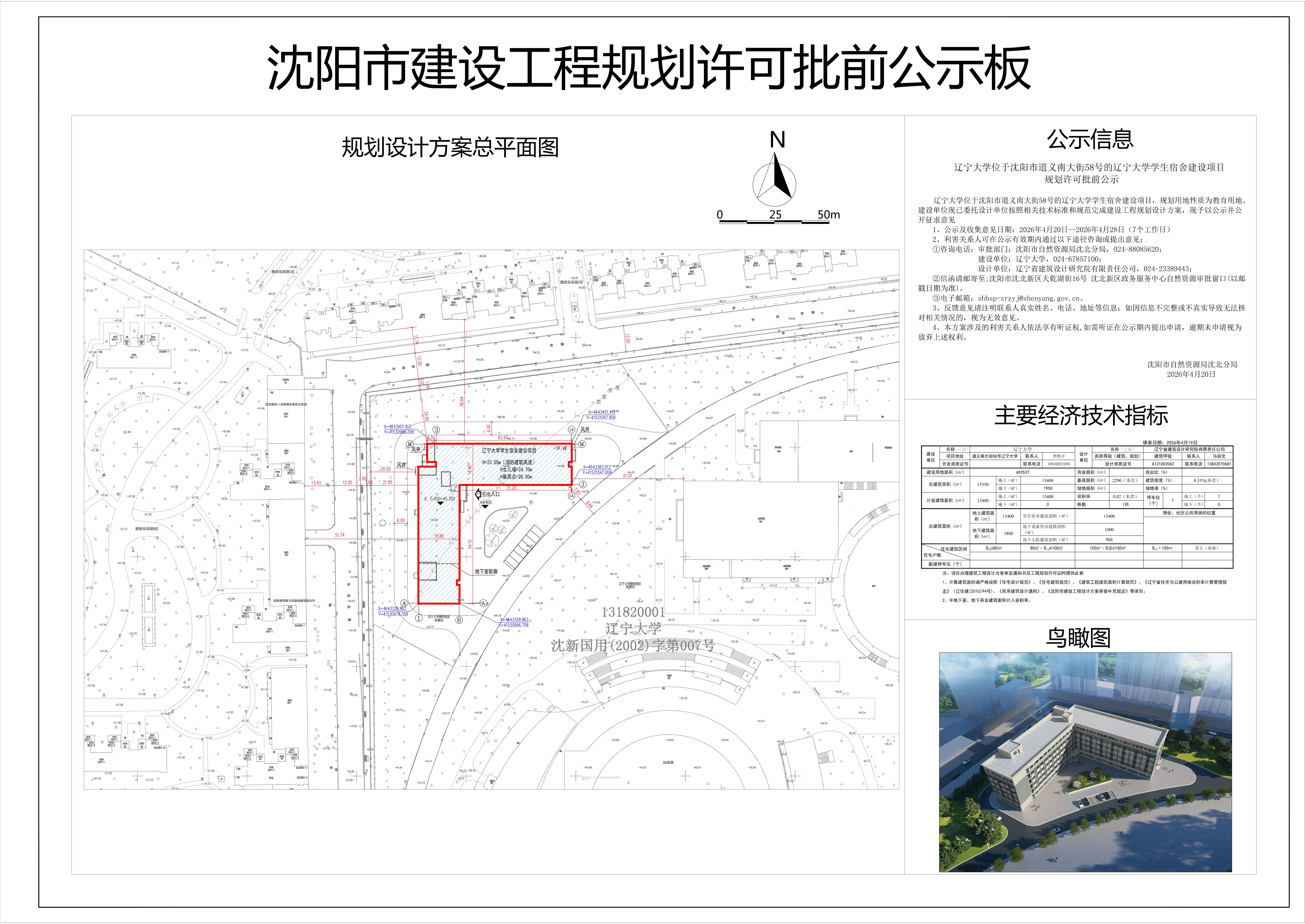辽宁大学位于沈阳市道义南大街58号的辽宁大学学生宿舍建设项目,规划用地性质为教育用地。建设单位现已委托设计单位按照相关技术标准和规范完成建设工程规划设计方案,现予以公示并公开征求意见 1、公示及收集意见日期:2026年4月20日--2026年4月28日(7个工作日) 2、利害关系人可在公示有效期内通过以下途径咨询或提出意见: ①咨询电话: 审批部门:沈阳市自然资源局沈北分局,024-88085620; 建设单位:辽宁大学,024-67857100; 设计单位:辽宁省建筑设计研究院有限责任公司,024-23389443; ②信函请邮寄至:沈阳市沈北新区天乾湖街16号,沈北新区政务服务中心自然资源审批窗口(以邮戳日期为准) ③电子邮箱:shbsp-zrzyj@shenyang.gov.cn 3、反馈意见请注明联系人真实姓名、电话、地址等信息;如因信息不完整或不真实导致无法核对相关情况的,视为无效意见。 4、本方案涉及的利害关系人依法享有听证权,如需听证在公示期内提出申请,逾期未申请视为放弃上述权利。 沈阳市自然资源局沈北分局 2026年4月20日