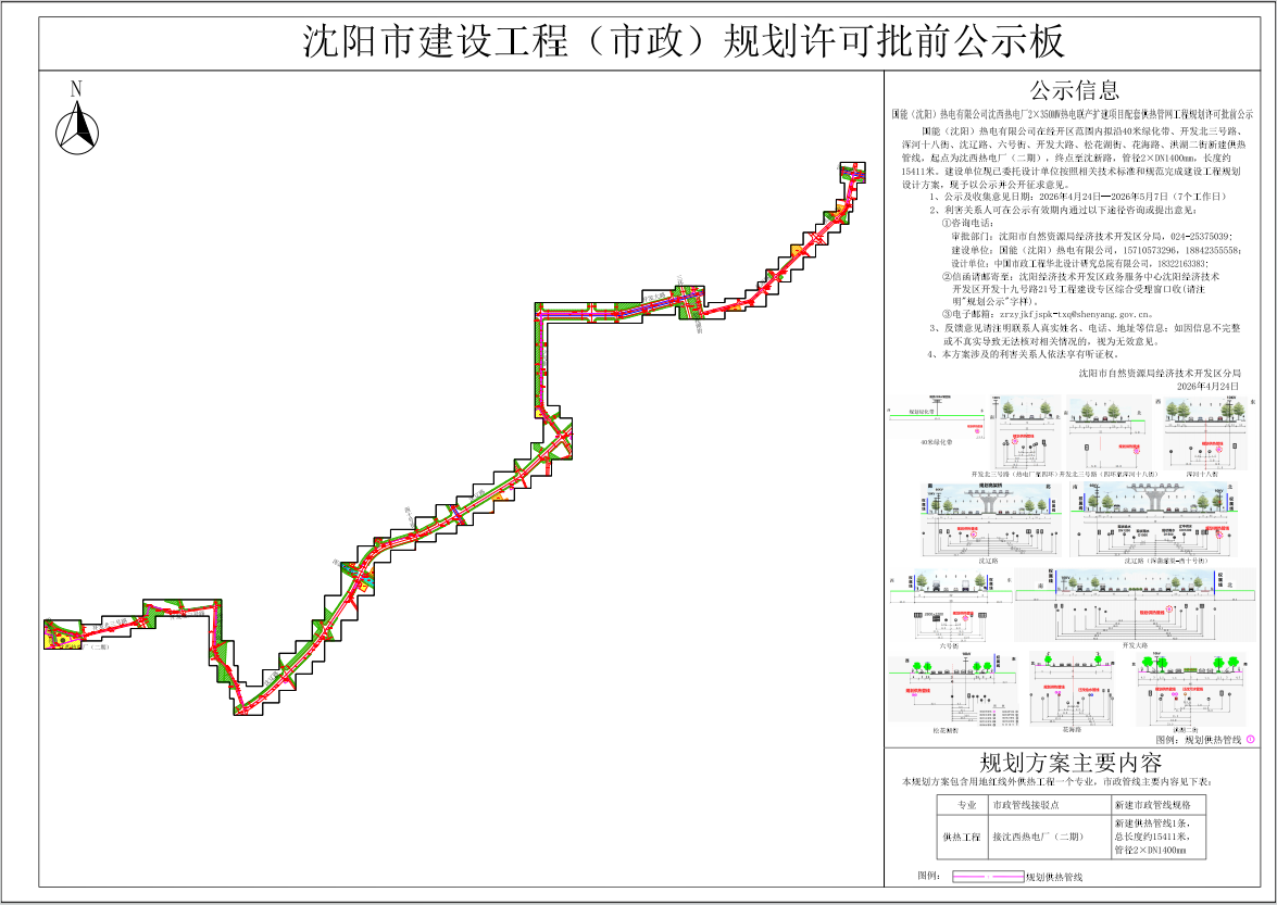 国能(沈阳)热电有限公司在经开区范围内拟沿40米绿化带、开发北三号路、浑河十八街、沈辽路、六号街、开发大路、松花湖街、花海路、洪湖二街新建供热管线,起点为沈西热电厂(二期),终点至沈新路,管径2×DN1400mm,长度约15411米。建设单位现已委托设计单位按照相关技术标准和规范完成建设工程规划设计方案,现予以公示并公开征求意见。 1、公示及收集意见日期:2026年4月24日—2026年5月7日(7个工作日) 2、利害关系人可在公示有效期内通过以下途径咨询或提出意见: ①咨询电话: 审批部门:沈阳市自然资源局经济技术开发区分局,024-25375039; 建设单位:国能(沈阳)热电有限公司,15710573296,18842355558; 设计单位:中国市政工程华北设计研究总院有限公司,18322163383; ②信函请邮寄至:沈阳经济技术开发区政务服务中心沈阳经济技术开发区开发十九号路21号工程建设专区综合受理窗口收(请注明“规划公示”字样) ③电子邮箱:zrzyjkfjspk-txq@shenyang.gov.cn 3、反馈意见请注明联系人真实姓名、电话、地址等信息;如因信息不完整或不真实导致无法核对相关情况的,视为无效意见。 4、本方案涉及的利害关系人依法享有听证权。 沈阳市自然资源局经济技术开发区分局 2026年4月24日