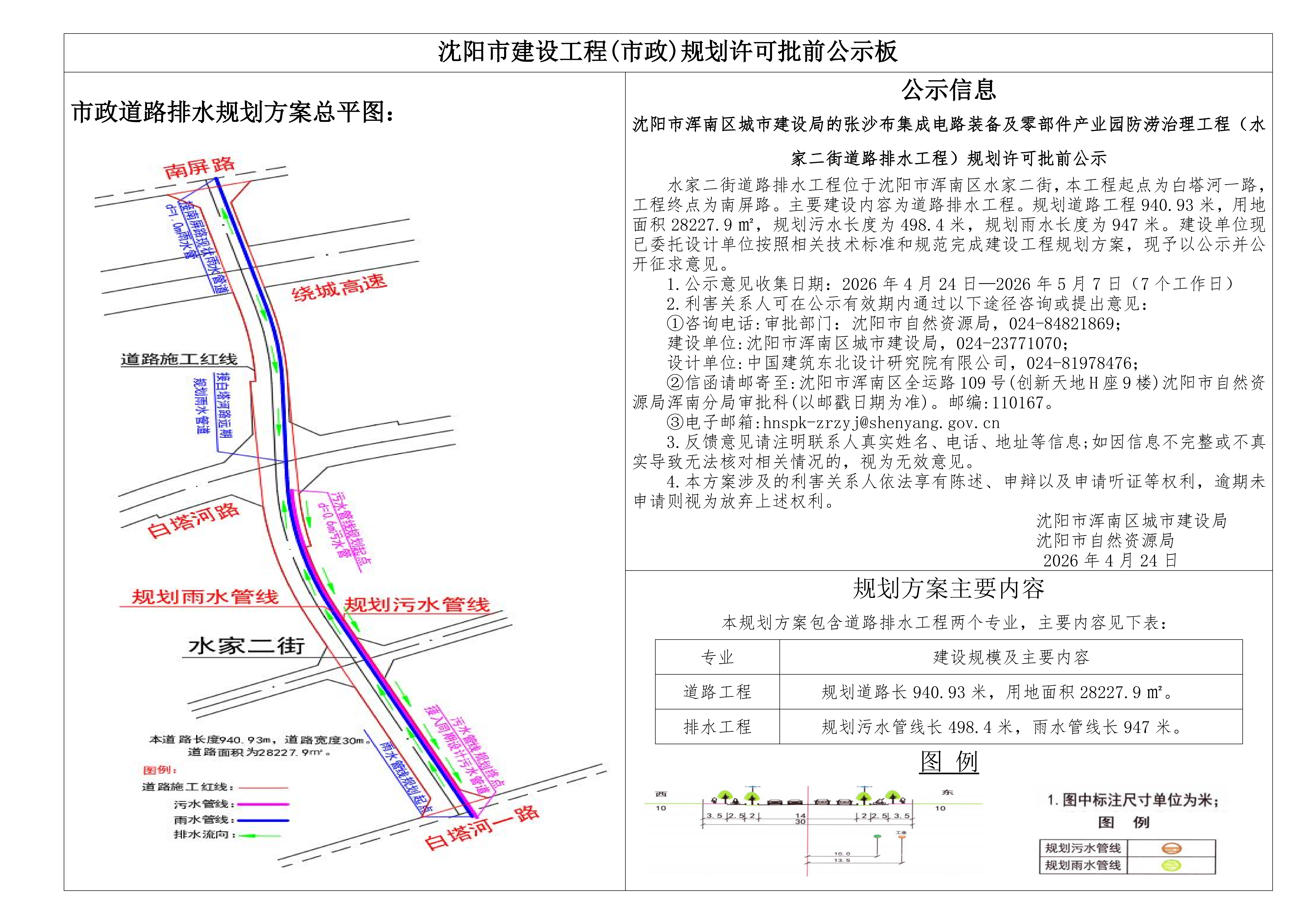水家二街道路排水工程位于沈阳市浑南区水家二街,本工程起点为白塔河一路,工程终点为南屏路。主要建设内容为道路排水工程。规划道路工程940.93米,用地面积28227.9㎡,规划污水长度为498.4米,规划雨水长度为947米。建设单位现已委托设计单位按照相关技术标准和规范完成建设工程规划方案,现予以公示并公开征求意见。 1.公示意见收集日期:2026年4月24日—2026年5月7日(7个工作日) 2.利害关系人可在公示有效期内通过以下途径咨询或提出意见: ①咨询电话: 审批部门:沈阳市自然资源局,024-84821869; 建设单位:沈阳市浑南区城市建设局,024-23771070; 设计单位:中国建筑东北设计研究院有限公司,024-81978476; ②信函请邮寄至:沈阳市浑南区全运路109号(创新天地H座9楼)沈阳市自然资源局浑南分局审批科(以邮戳日期为准)邮编:110167。 ③电子邮箱:hnspk-zrzyj@shenyang.gov.cn 3.反馈意见请注明联系人真实姓名、电话、地址等信息;如因信息不完整或不真实导致无法核对相关情况的,视为无效意见。 4.本方案涉及的利害关系人依法享有陈述、申辩以及申请听证等权利,逾期未申请则视为放弃上述权利。