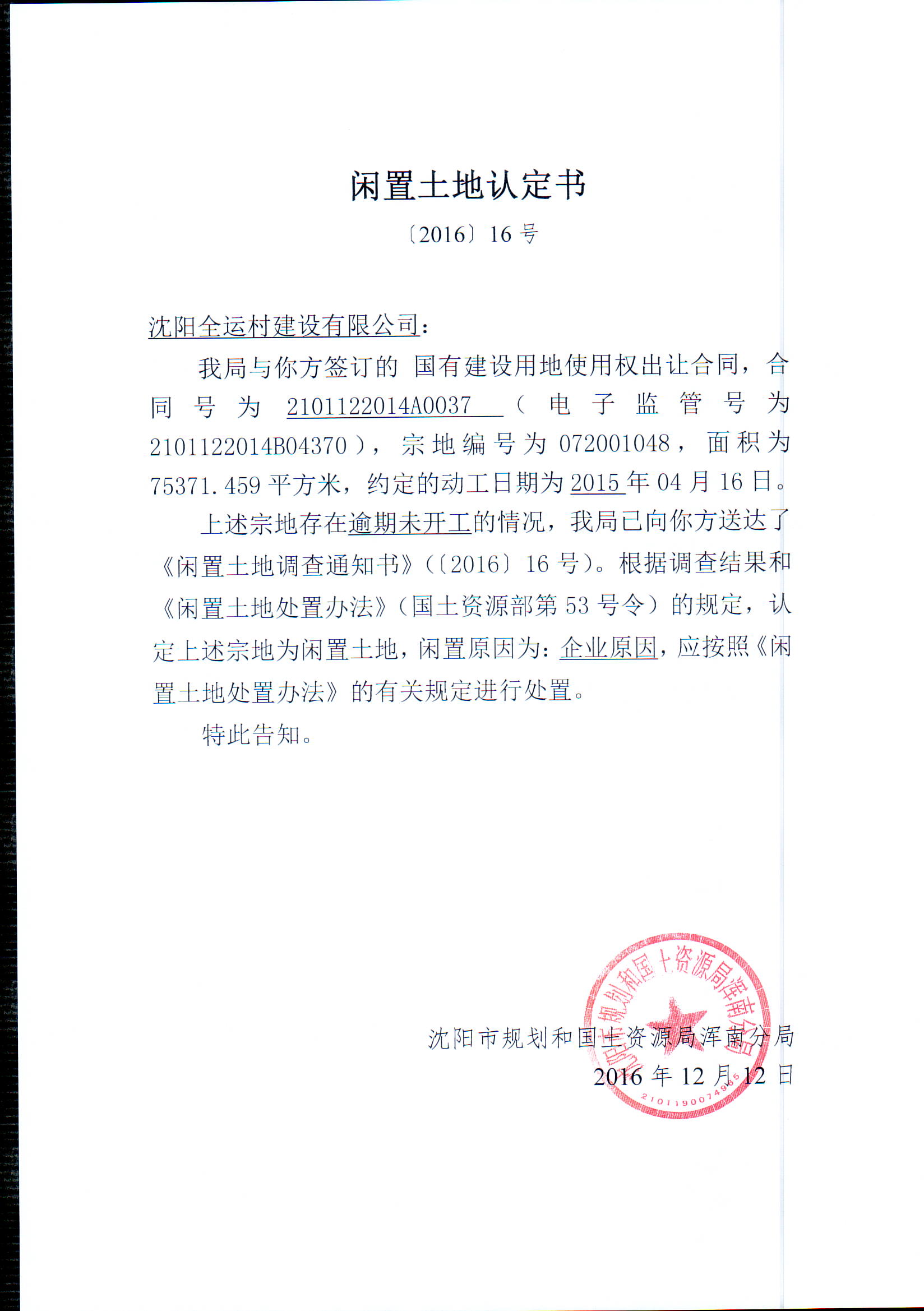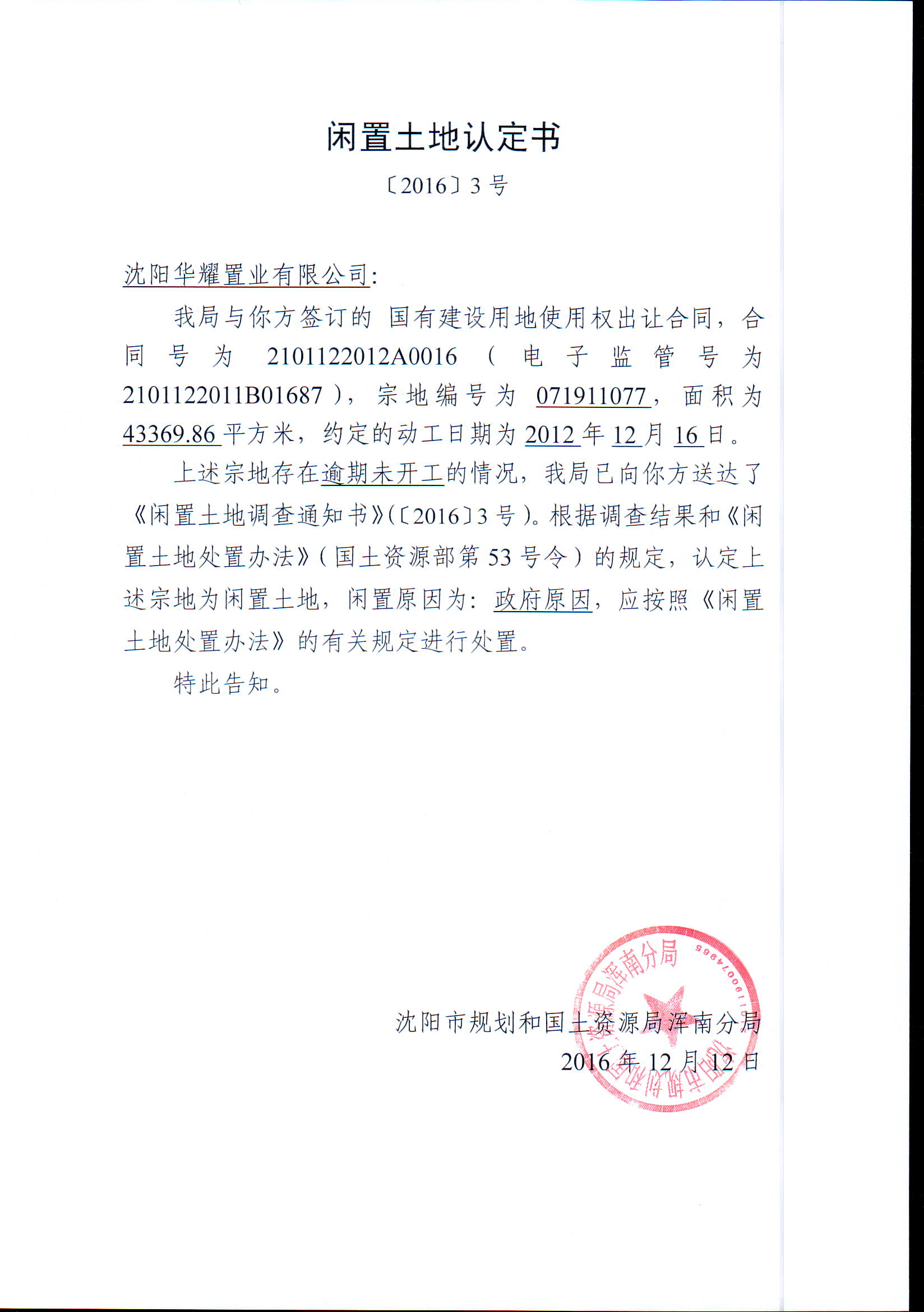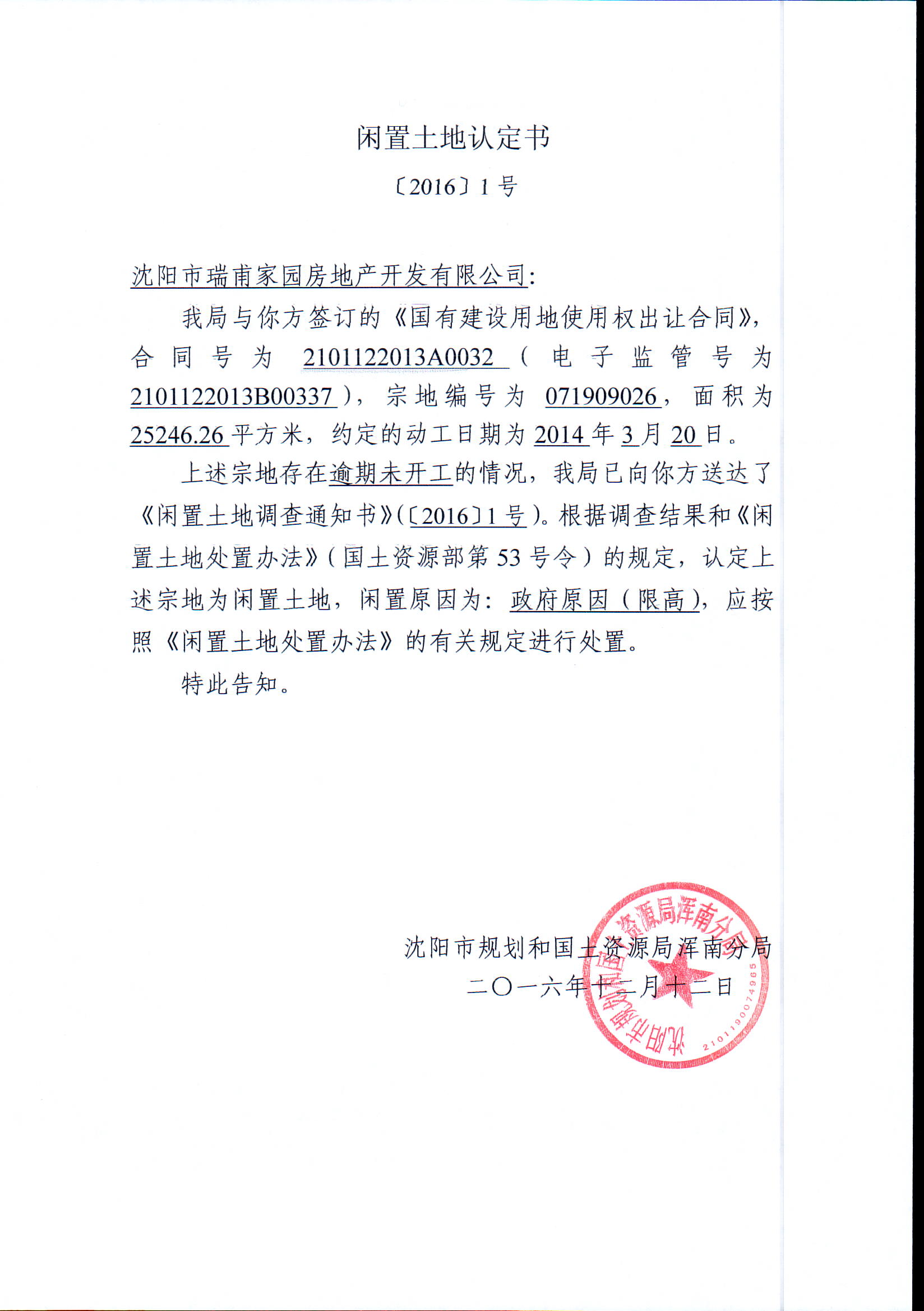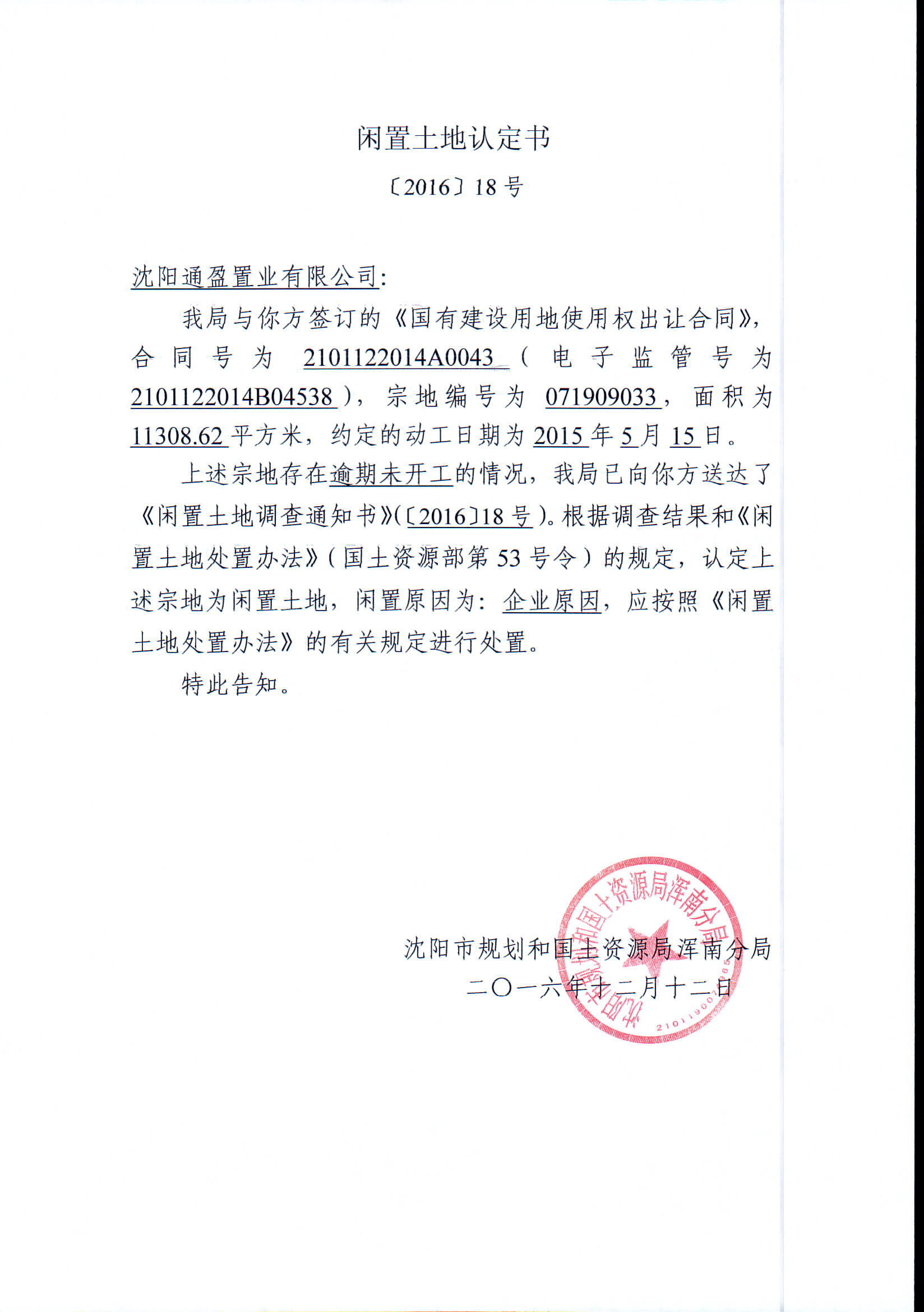 闲置土地认定书沈自然资沈北闲认字[2025]3号