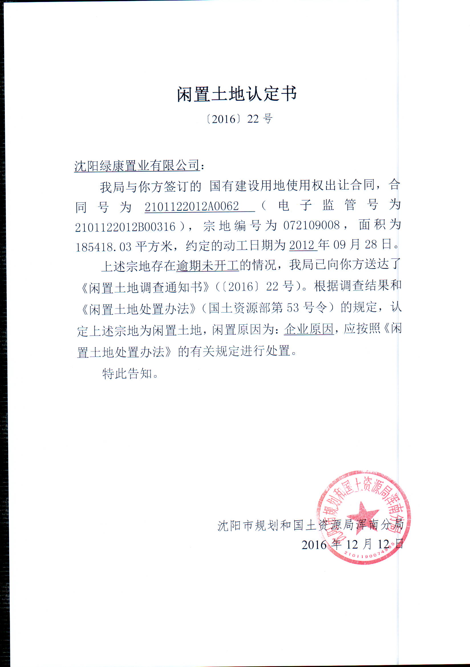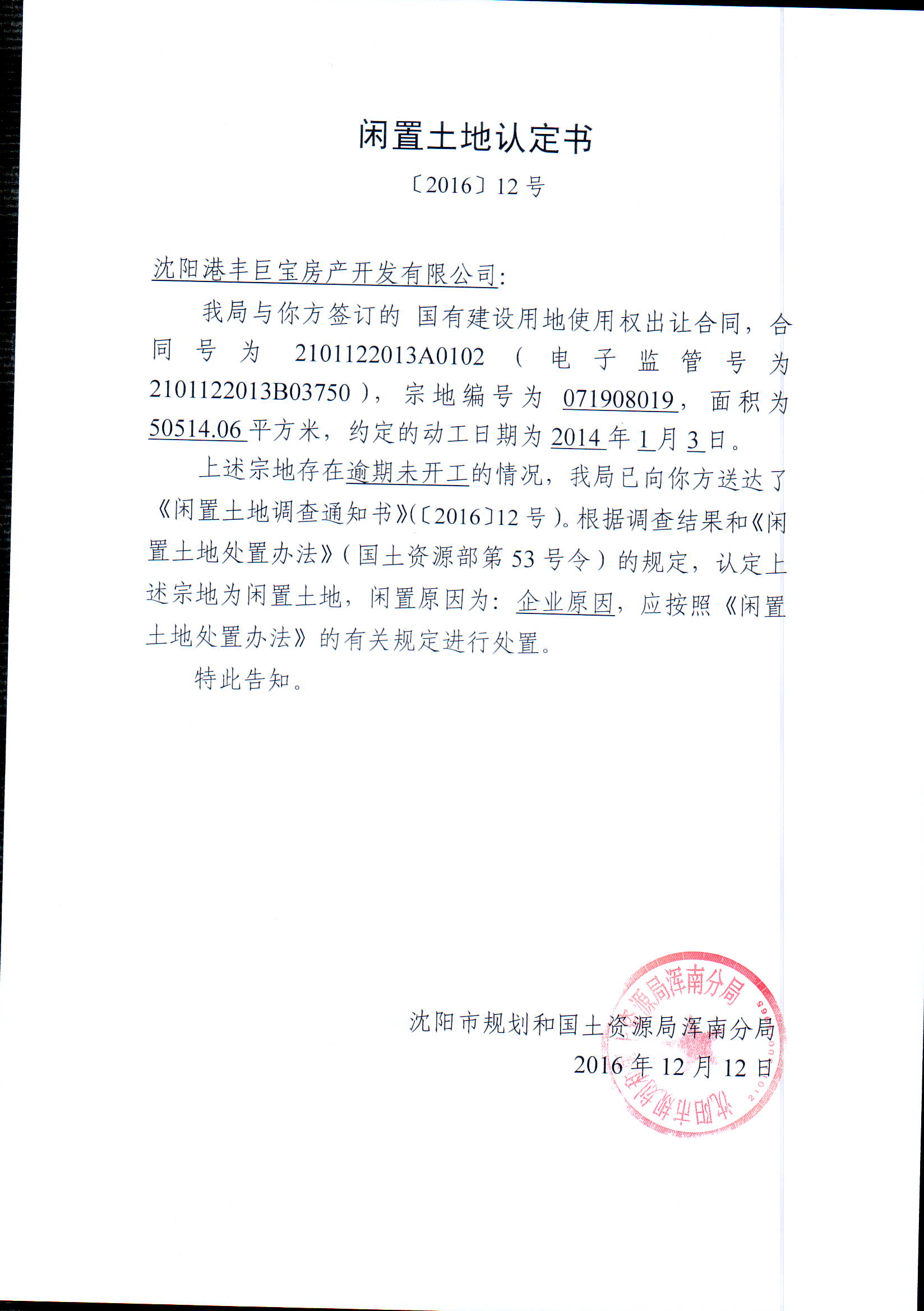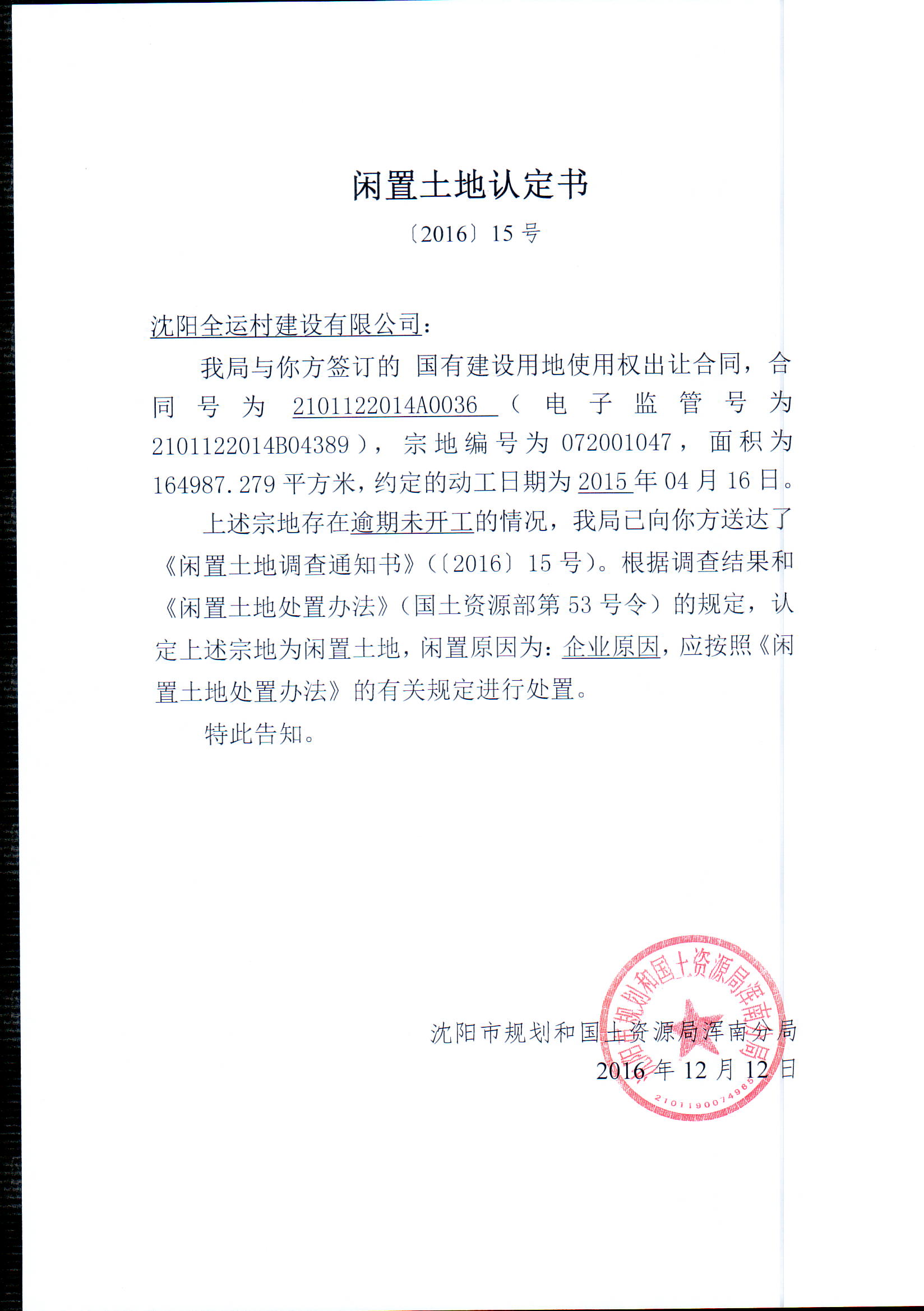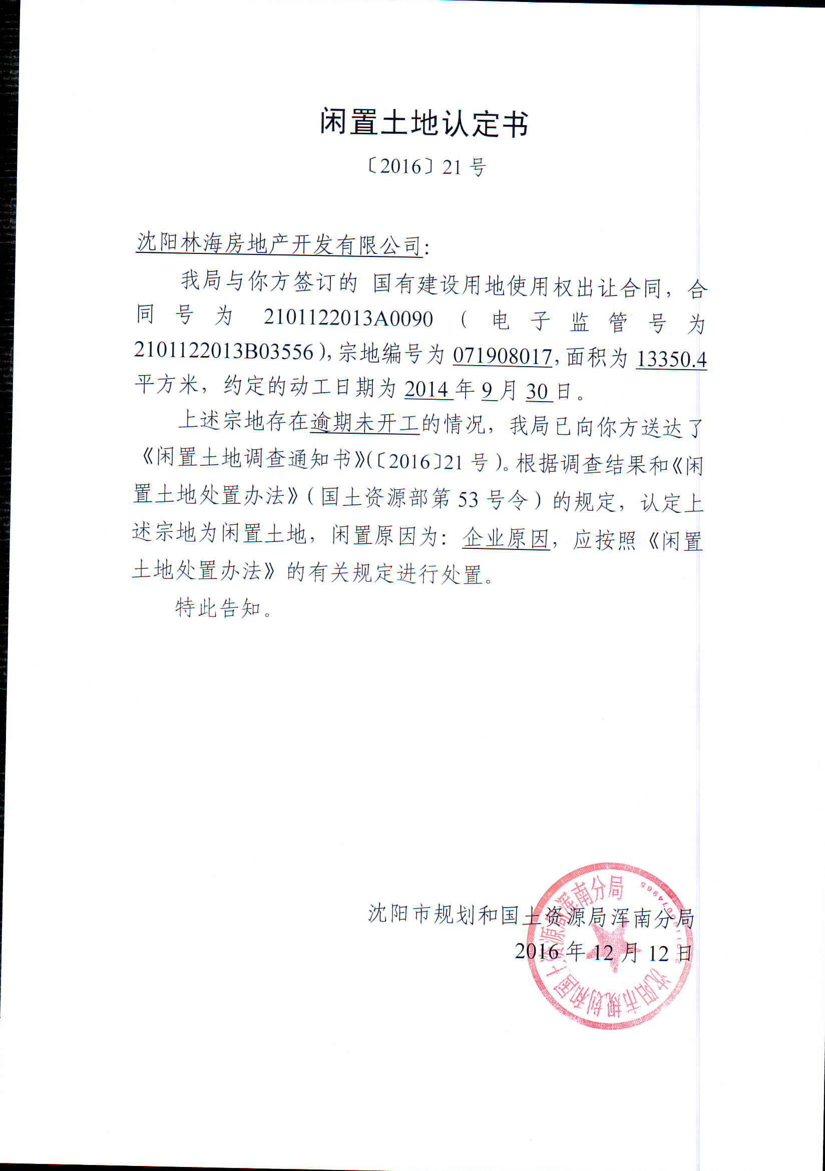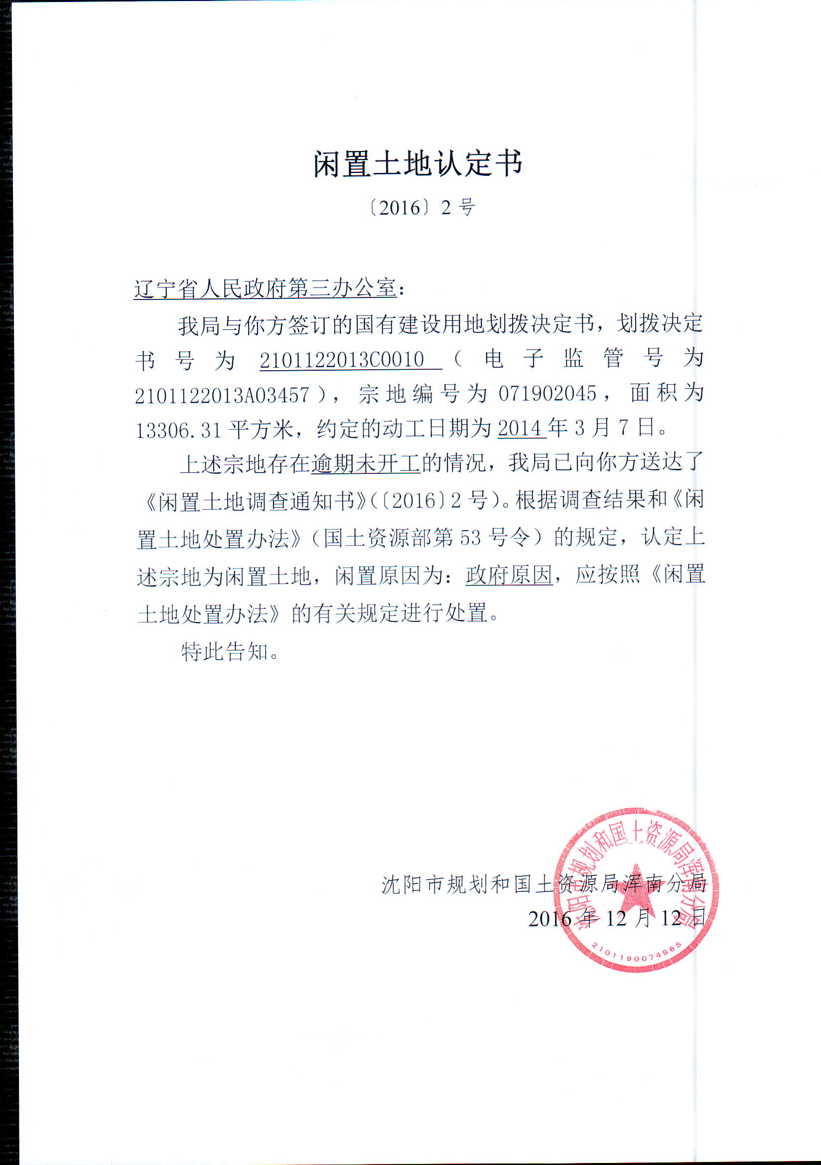 闲置土地认定书沈自然资沈北闲认字[2025]3号
