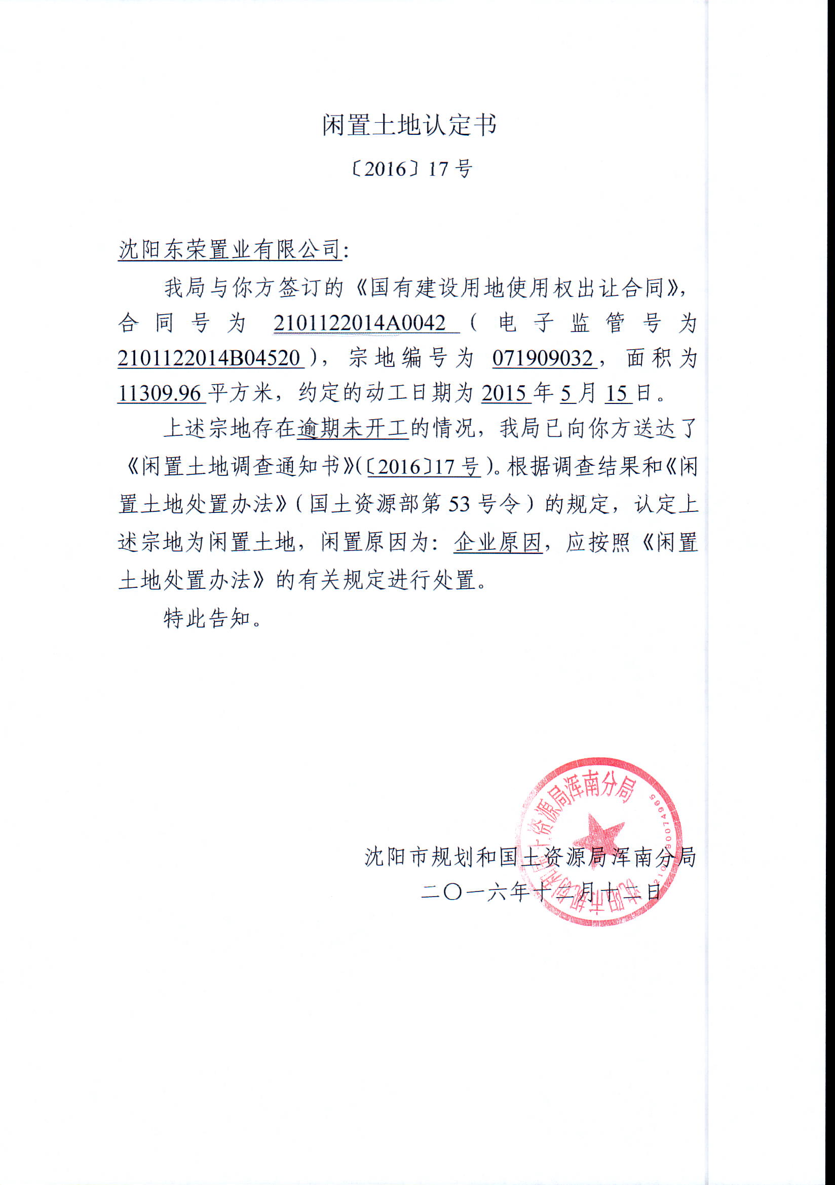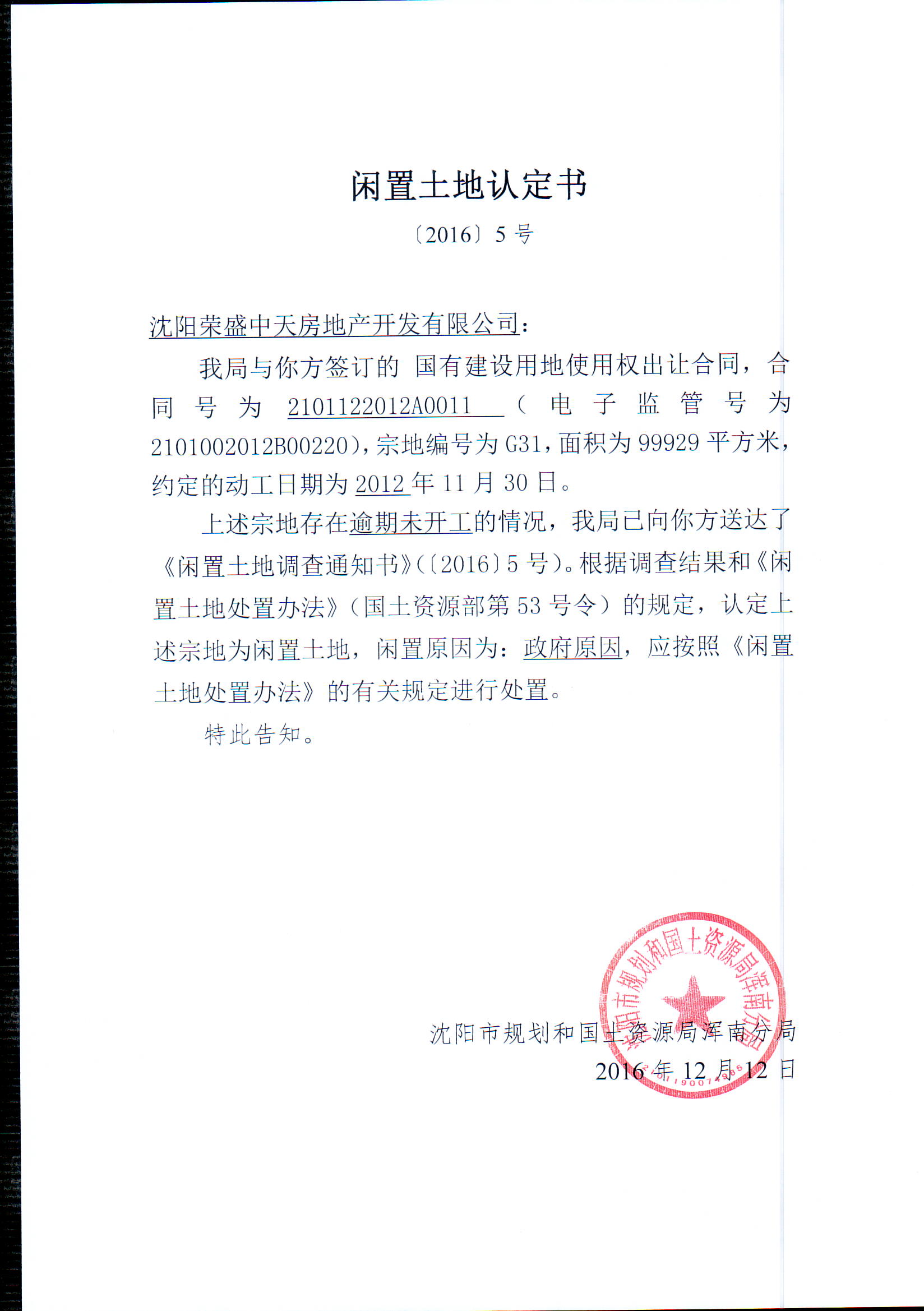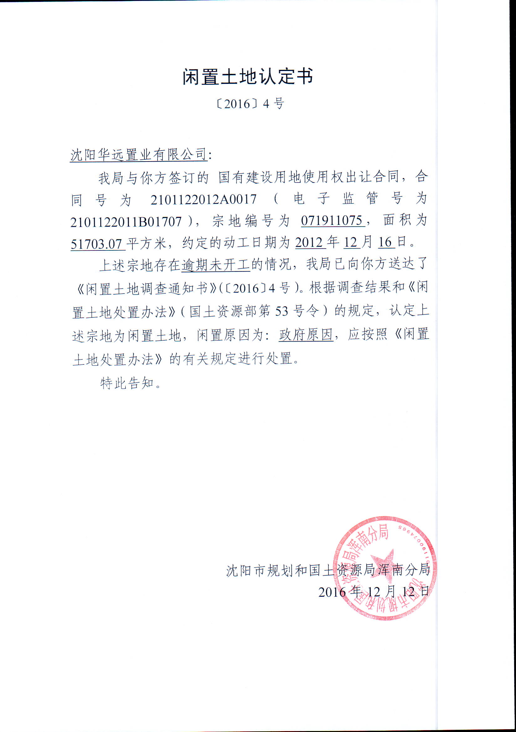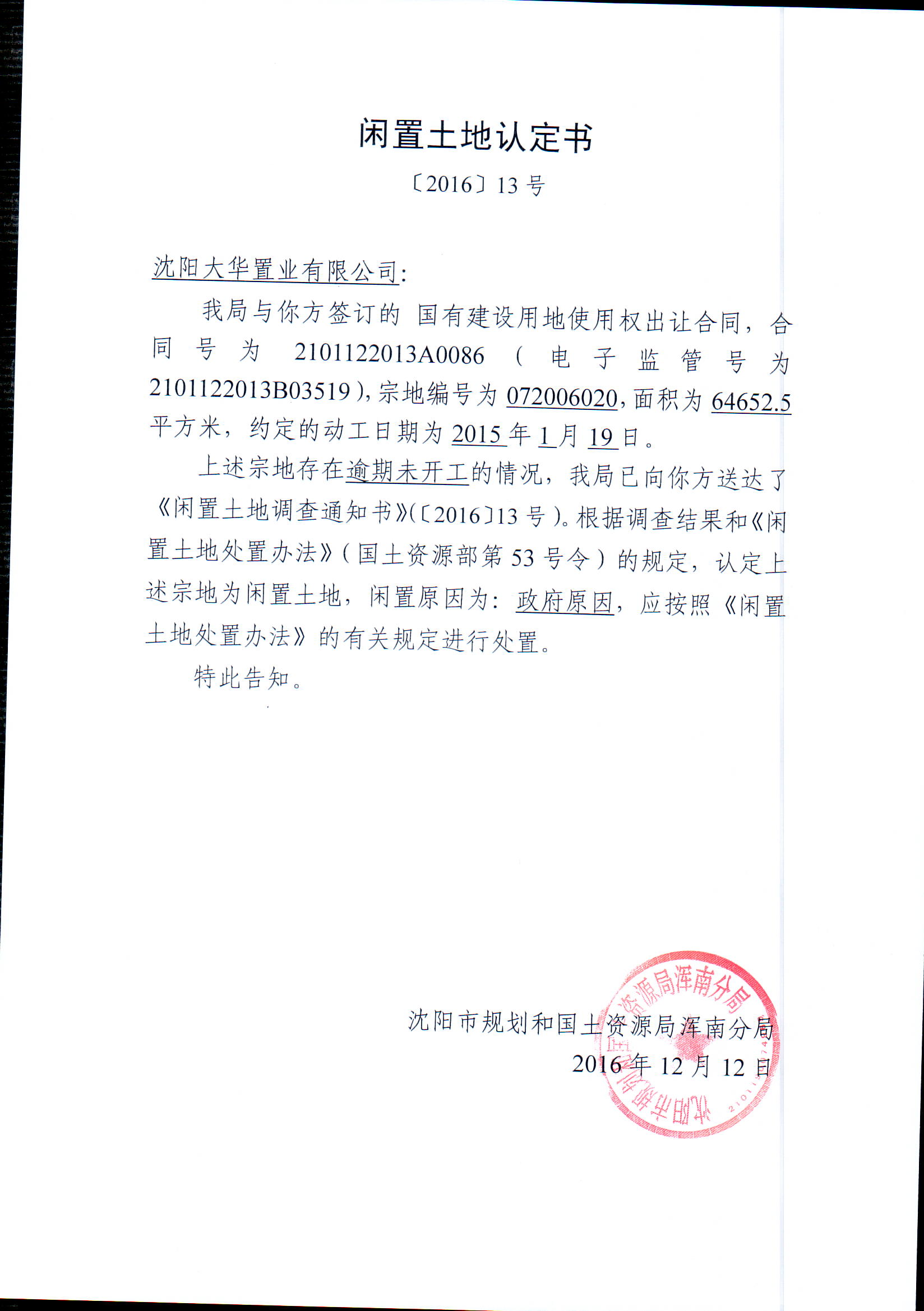 闲置土地认定书沈自然资沈北闲认字[2025]3号