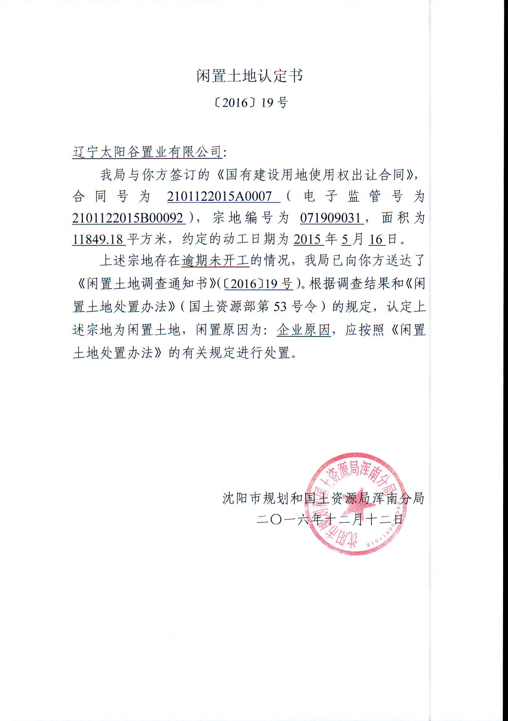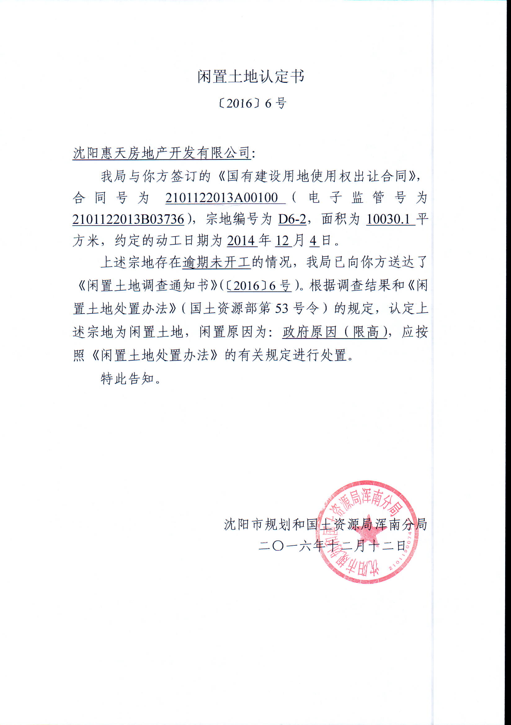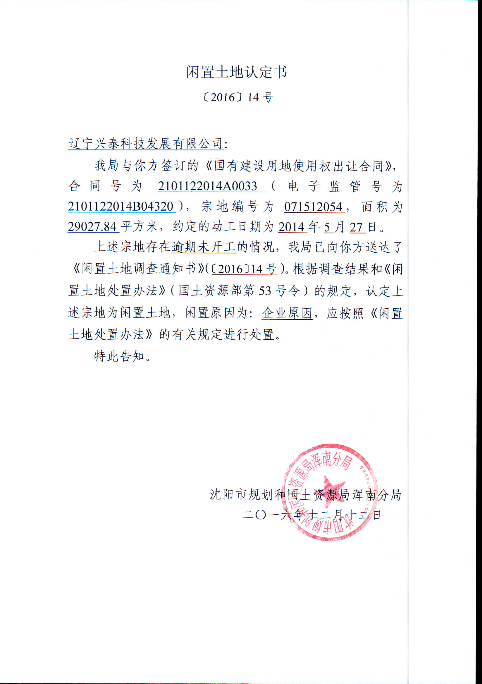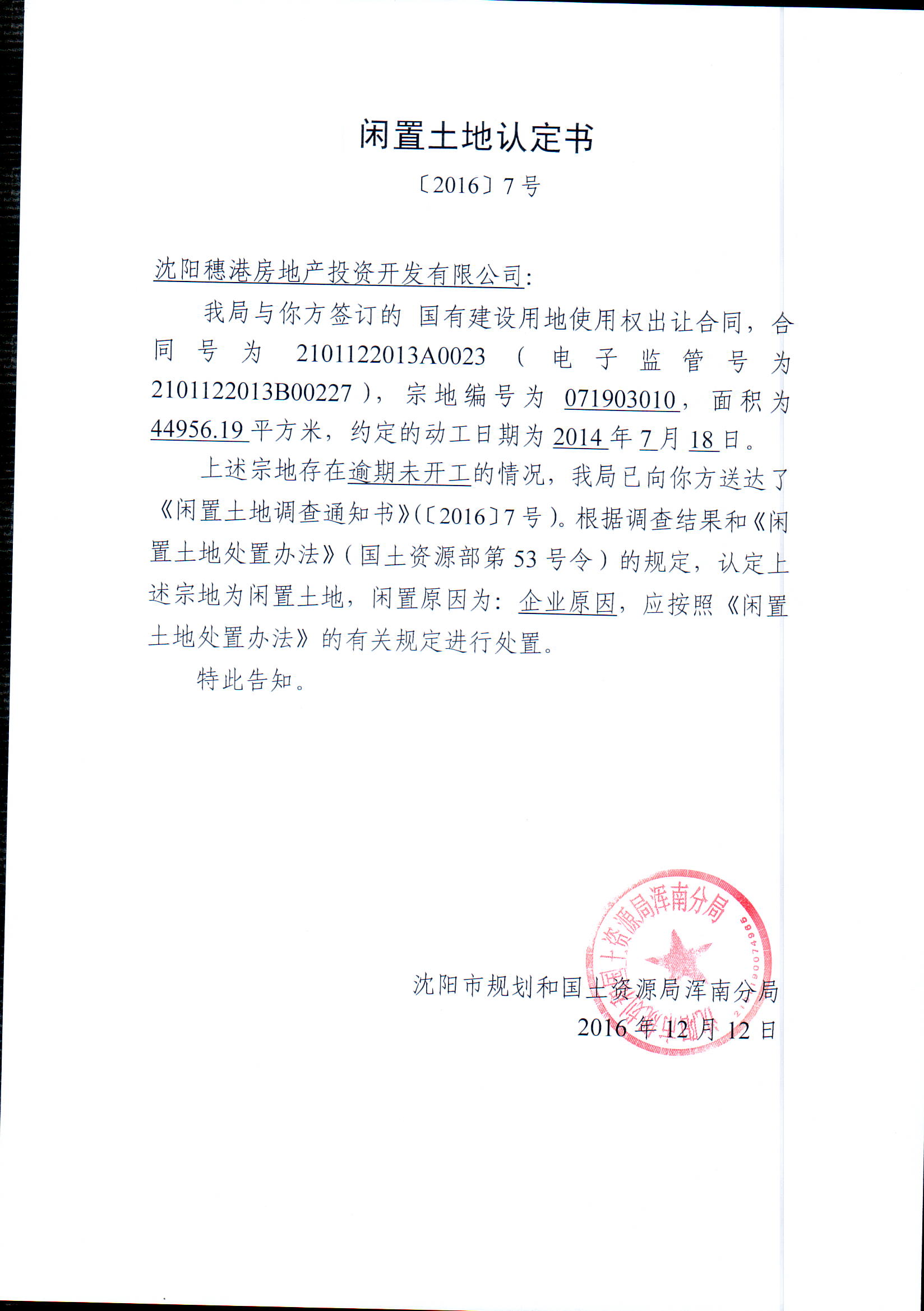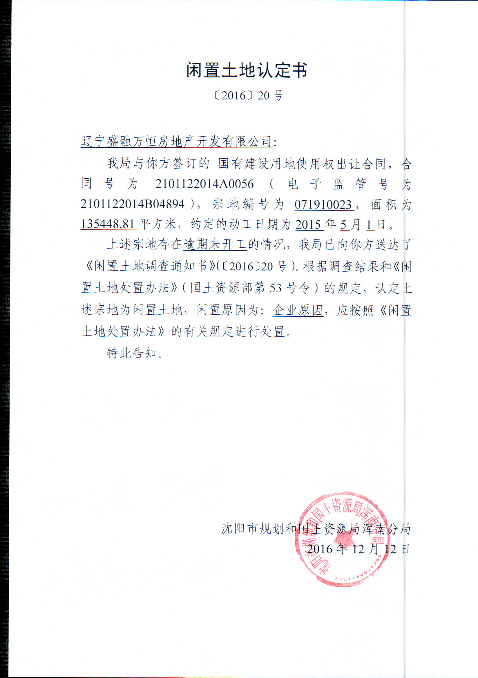 闲置土地认定书沈自然资沈北闲认字[2025]3号