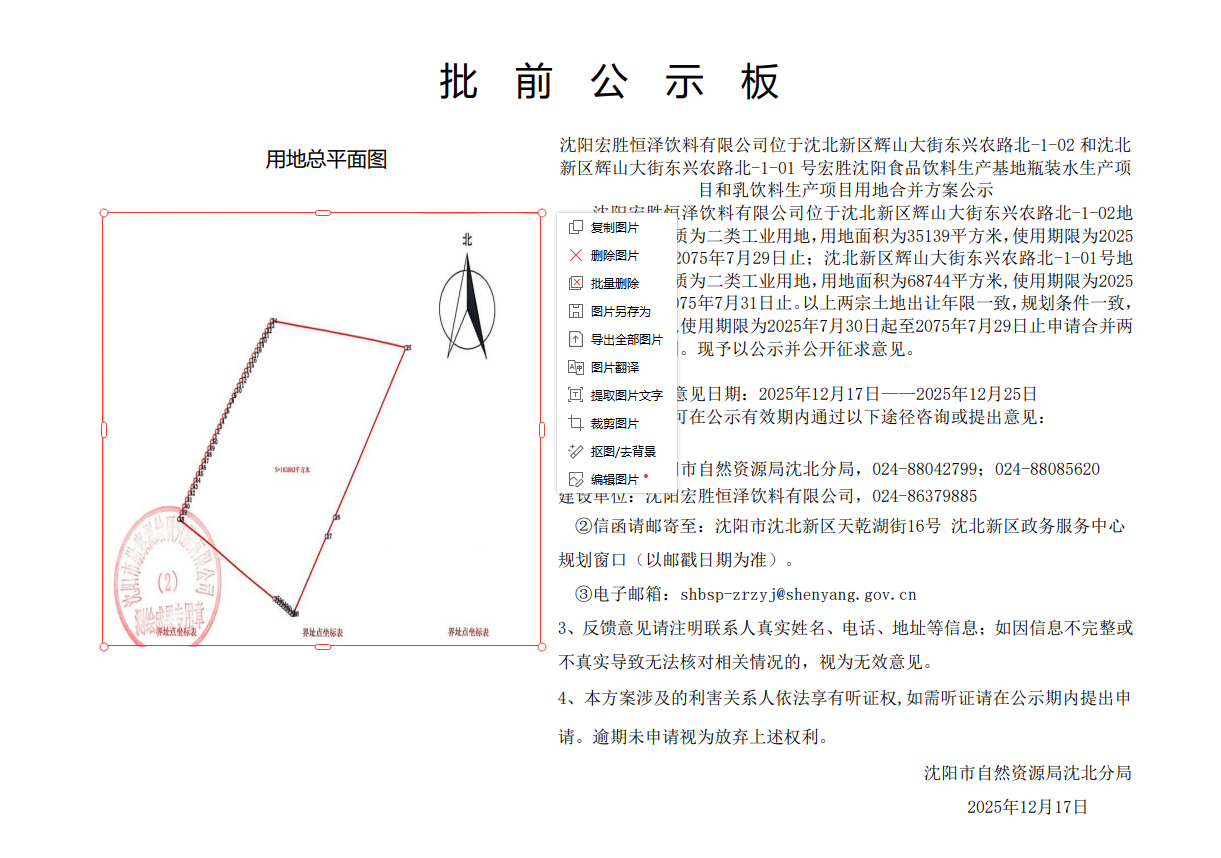 沈阳宏胜恒泽饮料有限公司位于沈北新区辉山大街东兴农路北-1-02和沈北新区辉山大街东兴农路北-1-01号宏胜沈阳食品饮料生产基地瓶装水生产项目和乳饮料生产项目用地合并方案公示